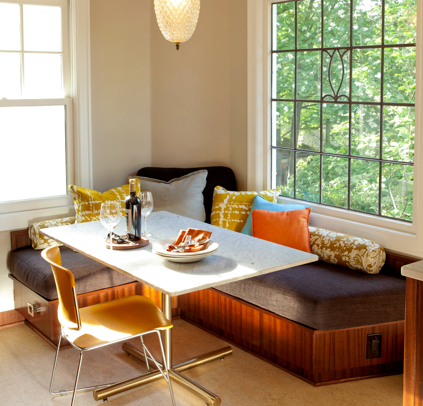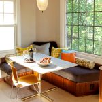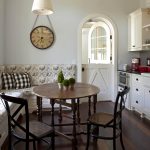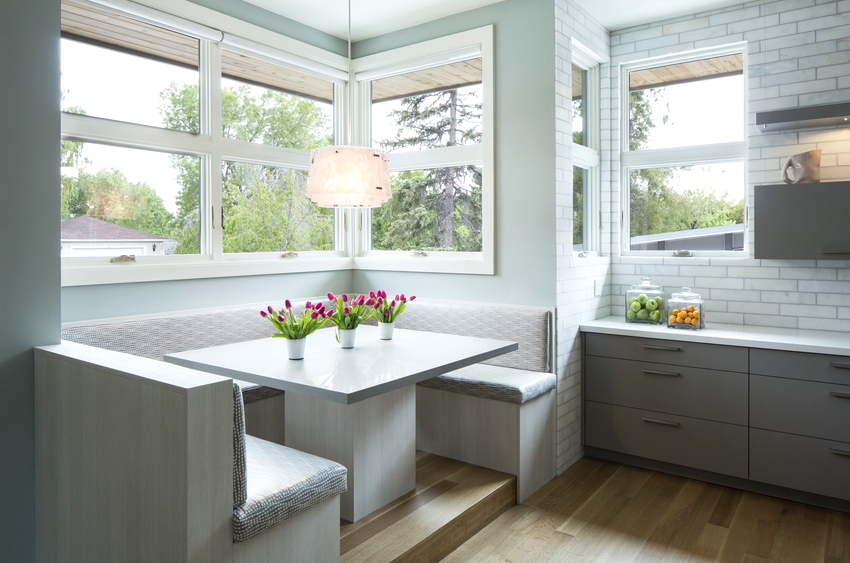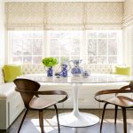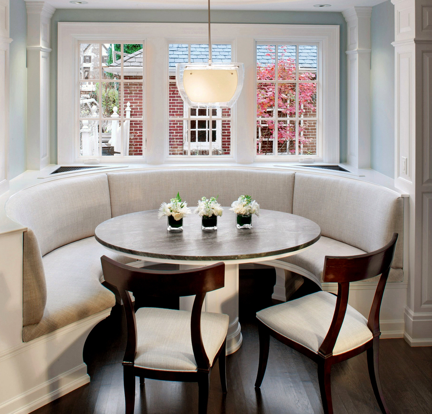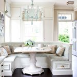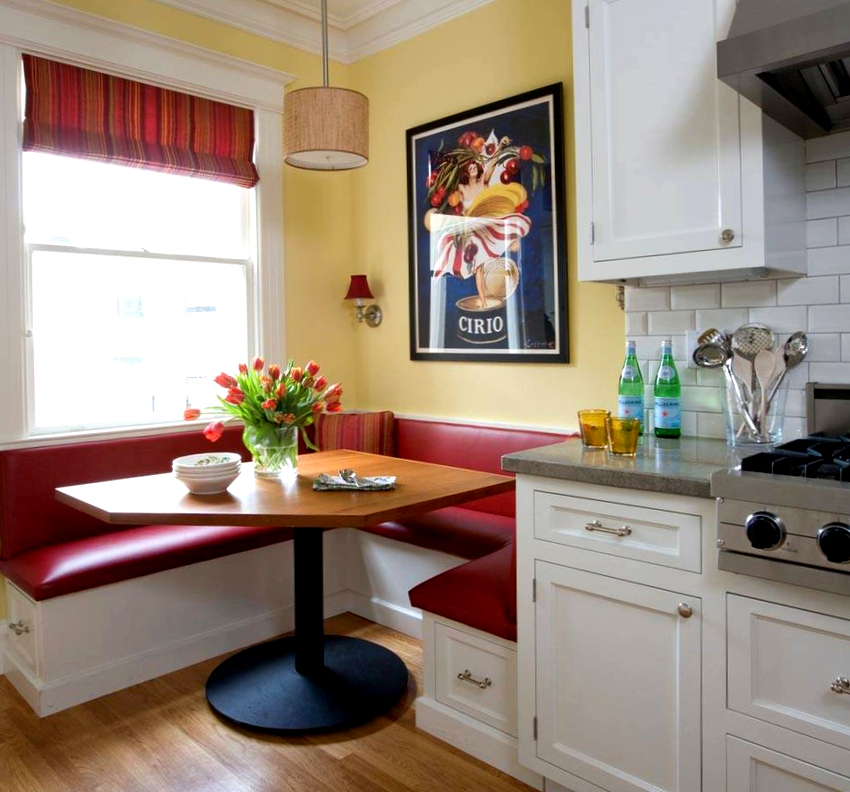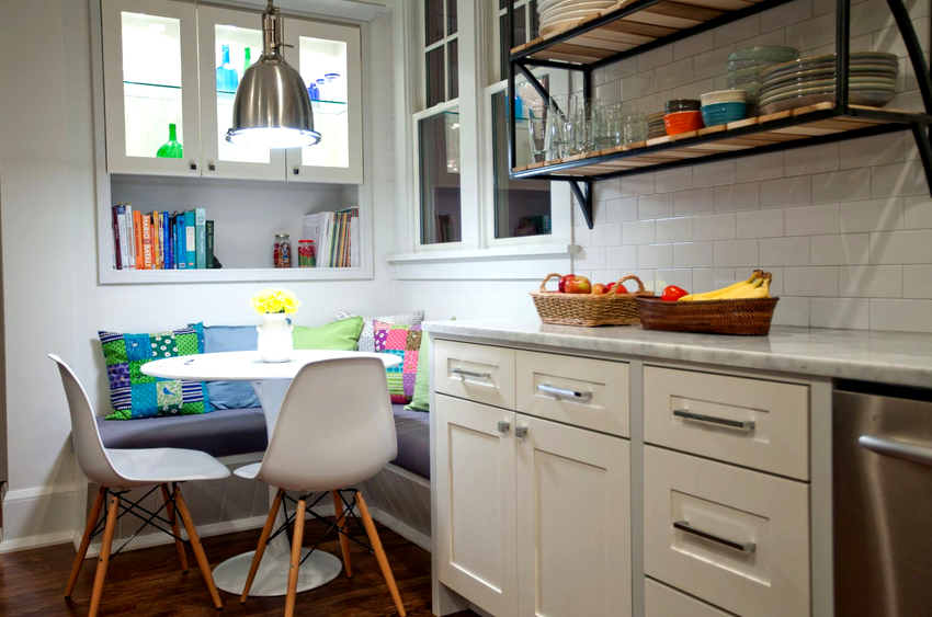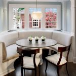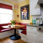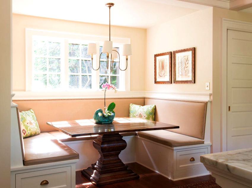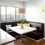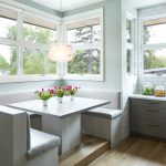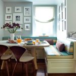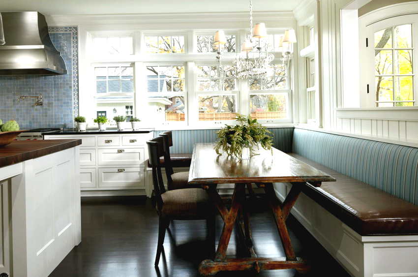 אם במטבח שלך יש חלון מפרץ, אתה לא יכול לחשוב על מקום טוב יותר לספה פינתית. אזור זה אידיאלי להקמת חדר אוכל קומפקטי.