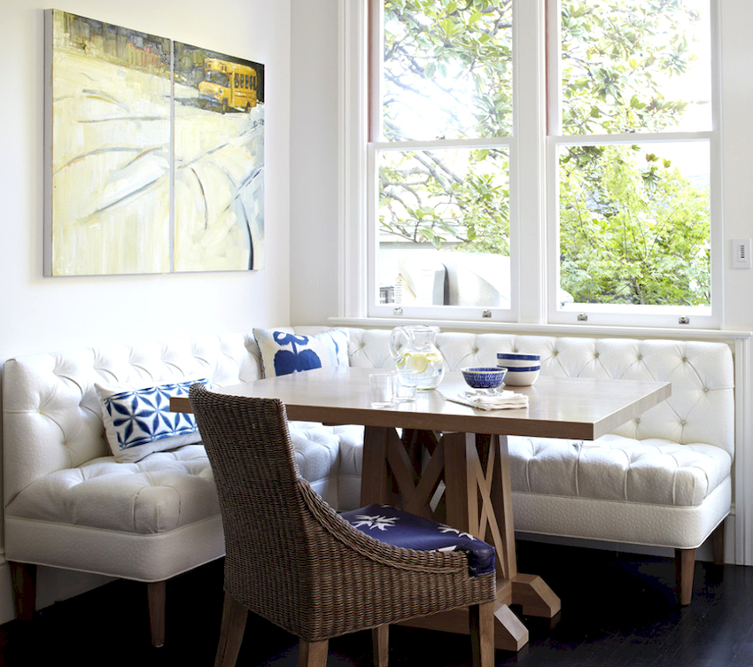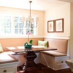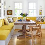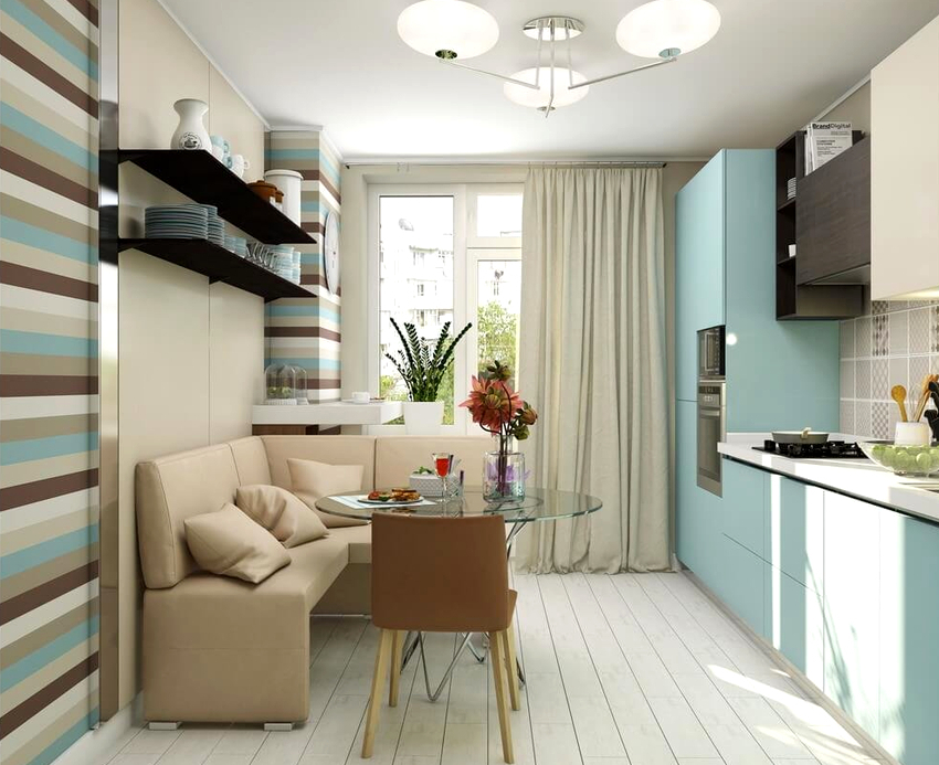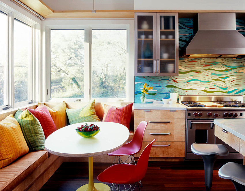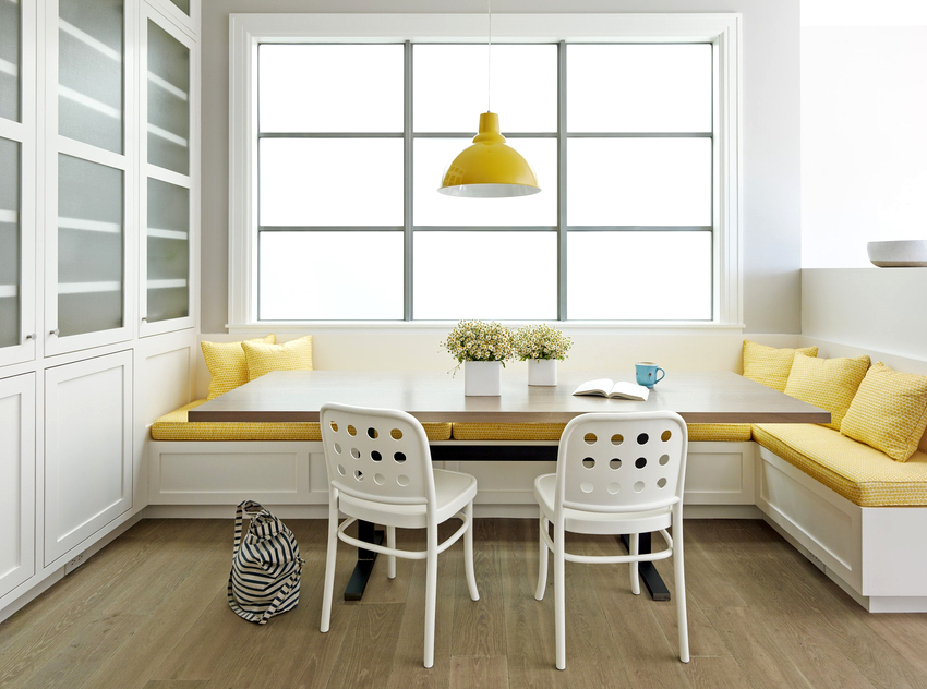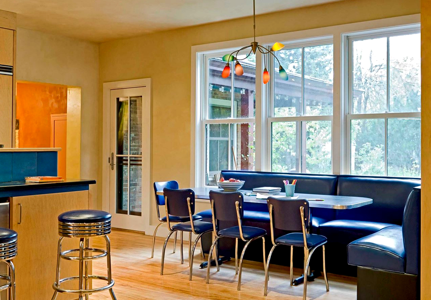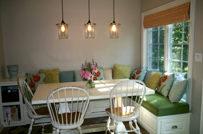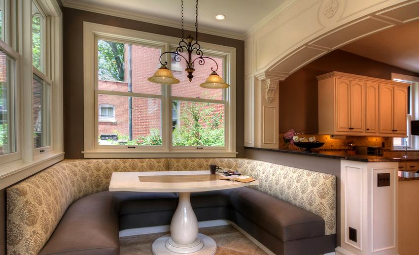 אם במטבח שלך יש חלון מפרץ, אתה לא יכול לחשוב על מקום טוב יותר לספה פינתית. אזור זה אידיאלי להקמת חדר אוכל קומפקטי.