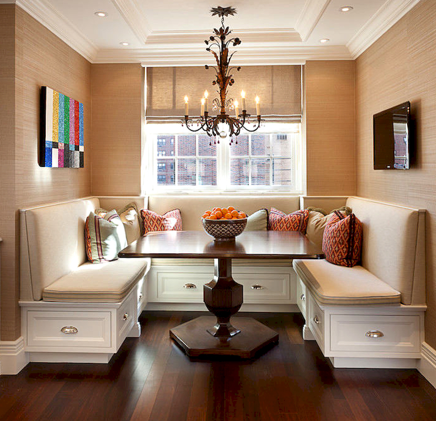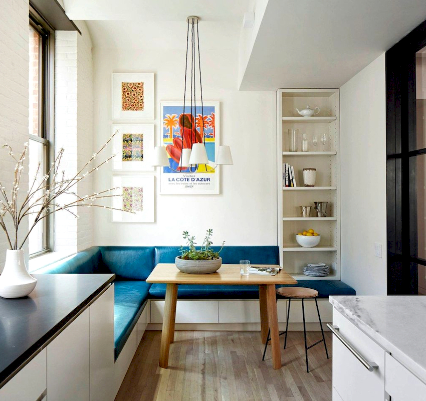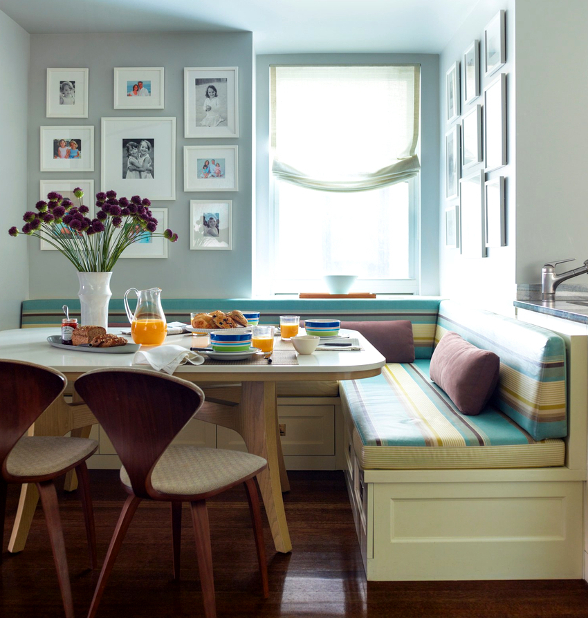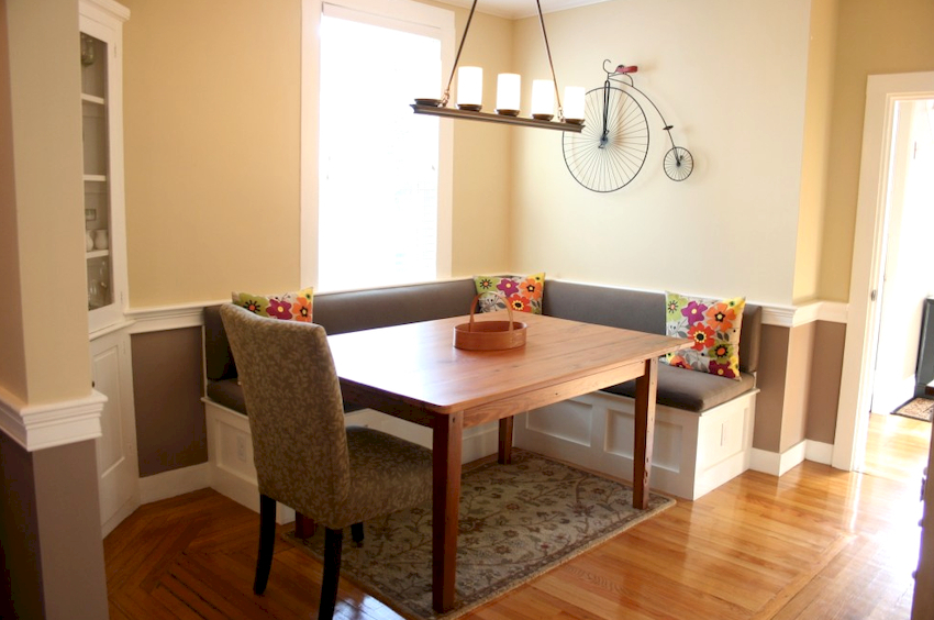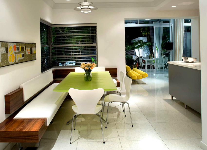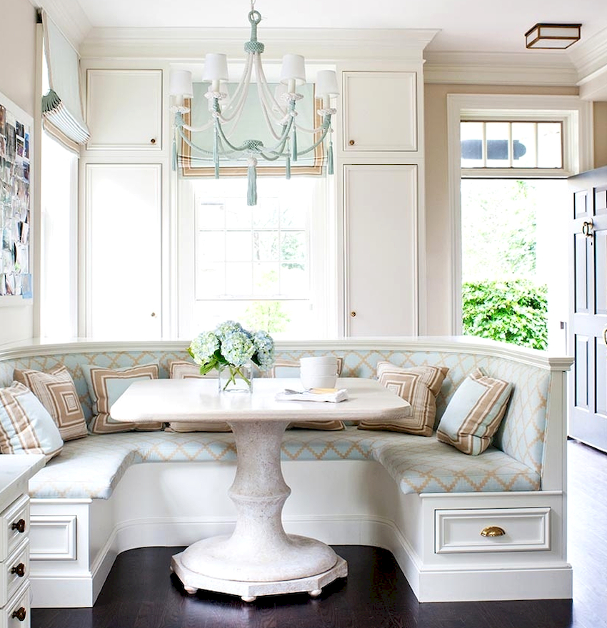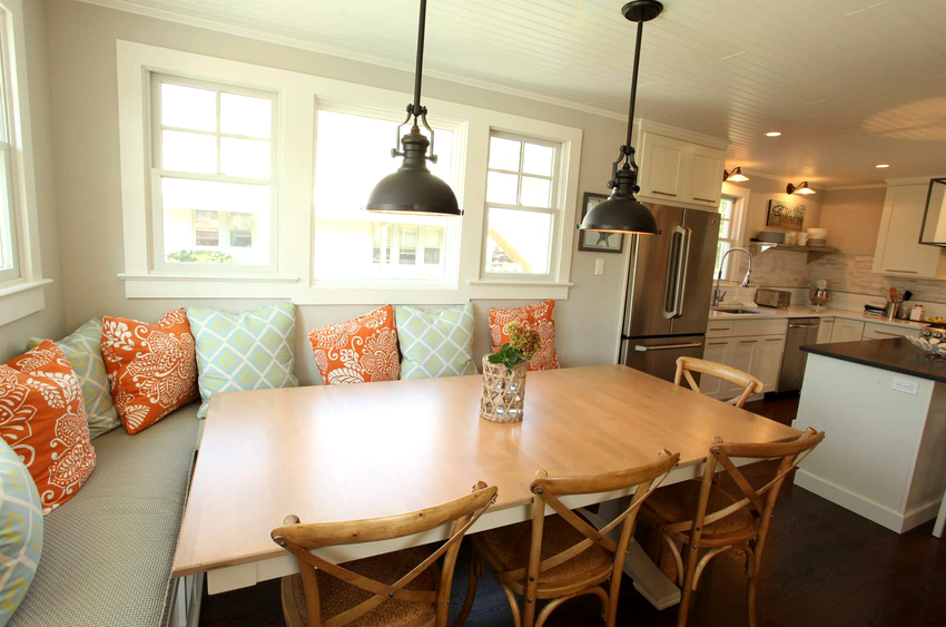 אם במטבח שלך יש חלון מפרץ, אתה לא יכול לחשוב על מקום טוב יותר לספה פינתית. אזור זה אידיאלי להקמת חדר אוכל קומפקטי.