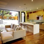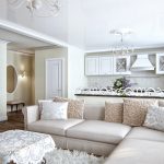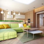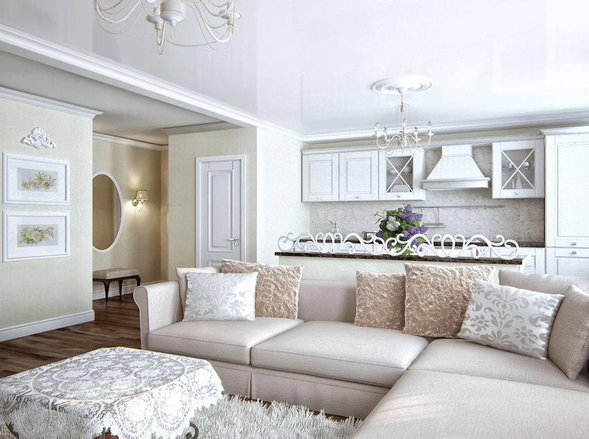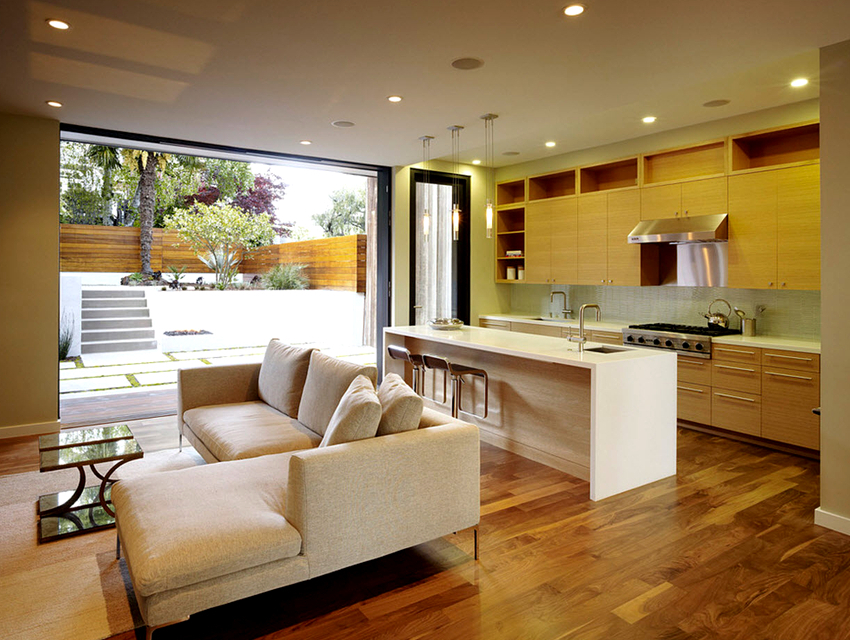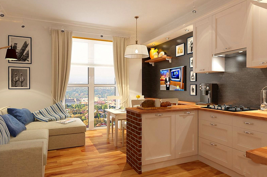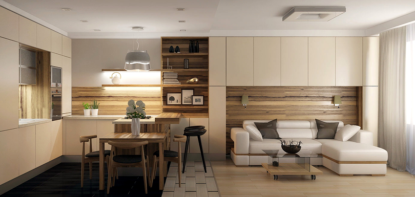 השיטה הפתוחה אינה מספקת נוכחות של מחיצות. הספה מותקנת מיד מאחורי האוזנייה. אם יש מעט מאוד מקום, תוכלו לנצח את האפשרות שתוארה בעבר לפינת האוכל: הספה בנויה על כנים, שהם חלק מסט המטבח.