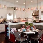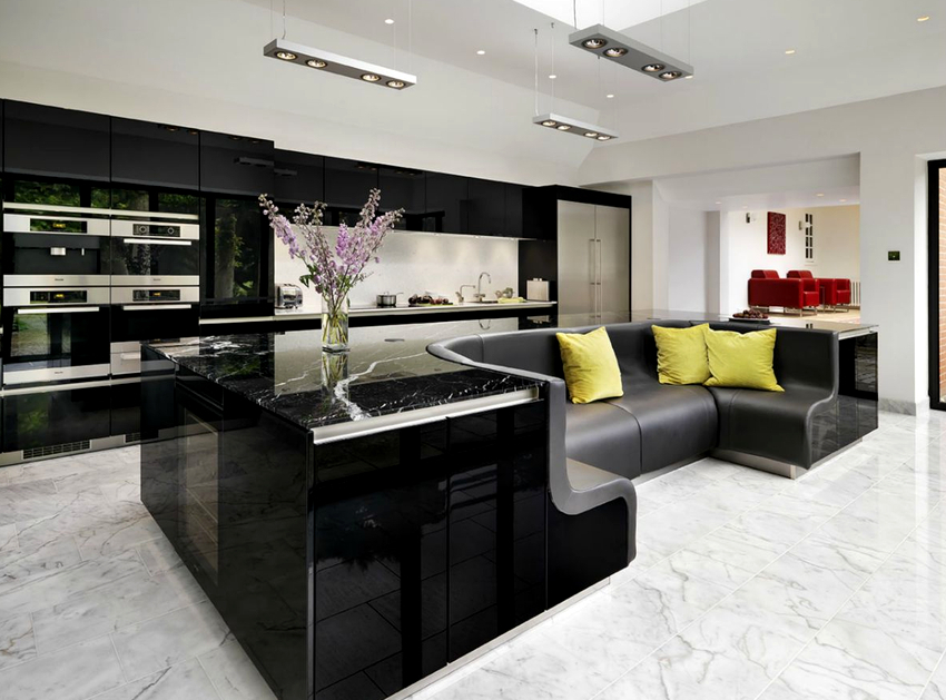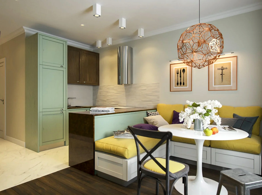 אזור העבודה במטבח יכול להיראות כמו אי. פתרון זה אופייני לחצרים גדולים. במקרה זה, הספה מצטרפת לאזור העבודה הממוקם באמצע החדר. התוצאה היא פינת אוכל פינתית.