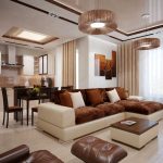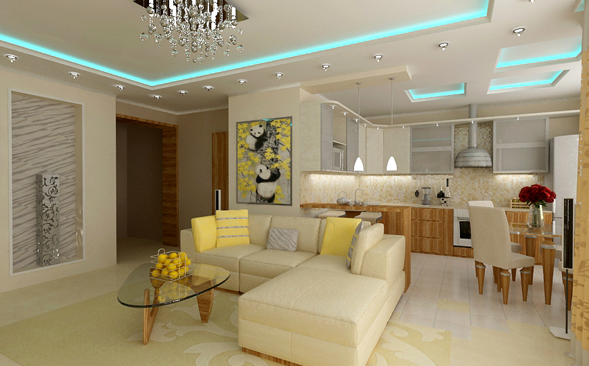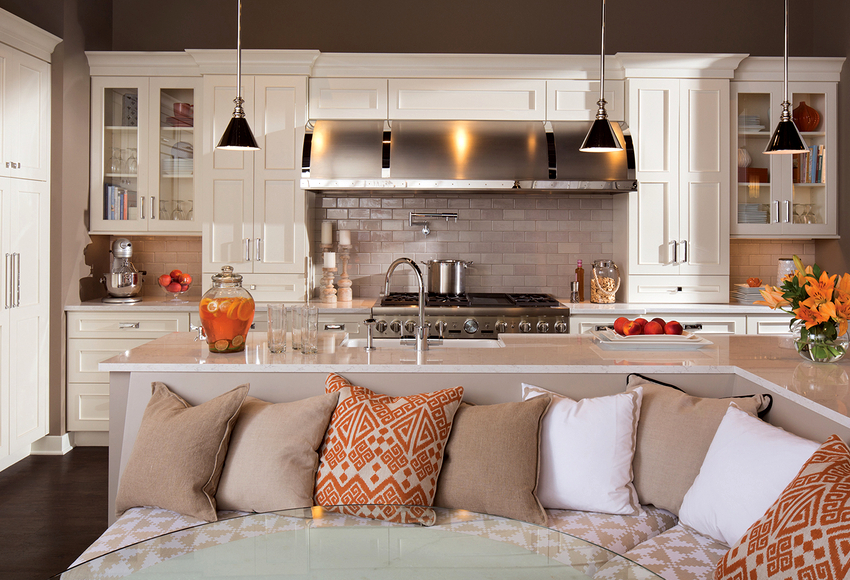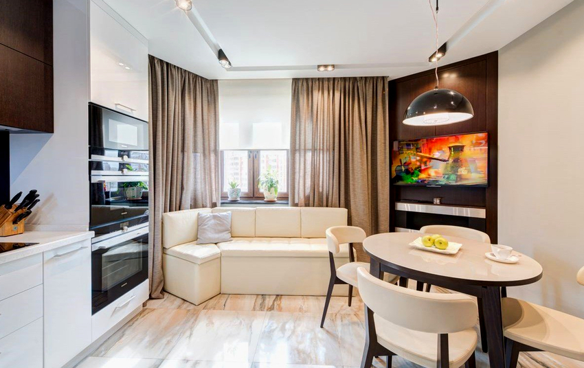 אזור הבילוי מאורגן לרוב באחד הקירות בצד אזור העבודה או ממול אליו. אם יש נישה בעיצוב של מטבח עם ספה פינתית, אז עדיף להכניס את הרהיט הזה לתוכו. כך תוכלו לחסוך מקום פנוי במטבח. בחדר מרובע גדול אין חטא להתקין ספה שתכבוש שני קירות. במקרה זה, העיצוב יכול להיות סטנדרטי או להתקין על דוכן, שנוצר על בסיס כנים.