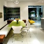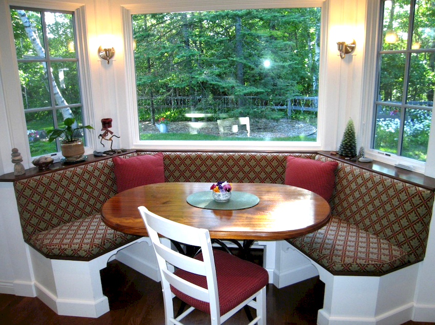 אם לעיצוב חלון המפרץ עומק רב, תוכלו להתקין כאן ספה פינתית בצורת U ושולחן אוכל מלבני. מודל זה מאפשר לך להכיל בו זמנית מספר רב של אנשים.