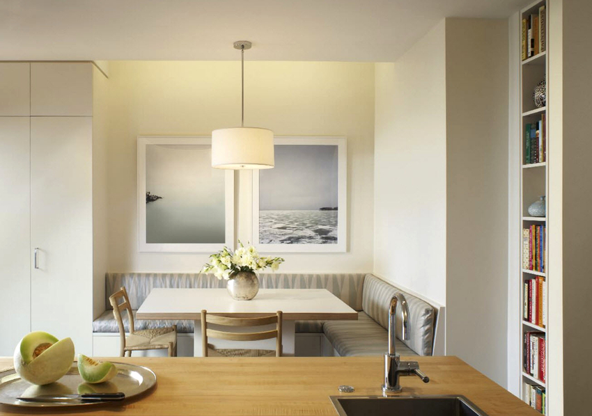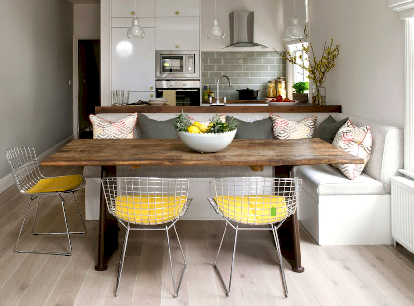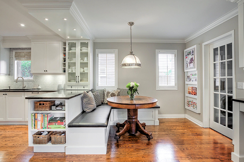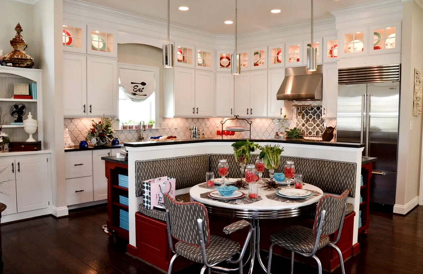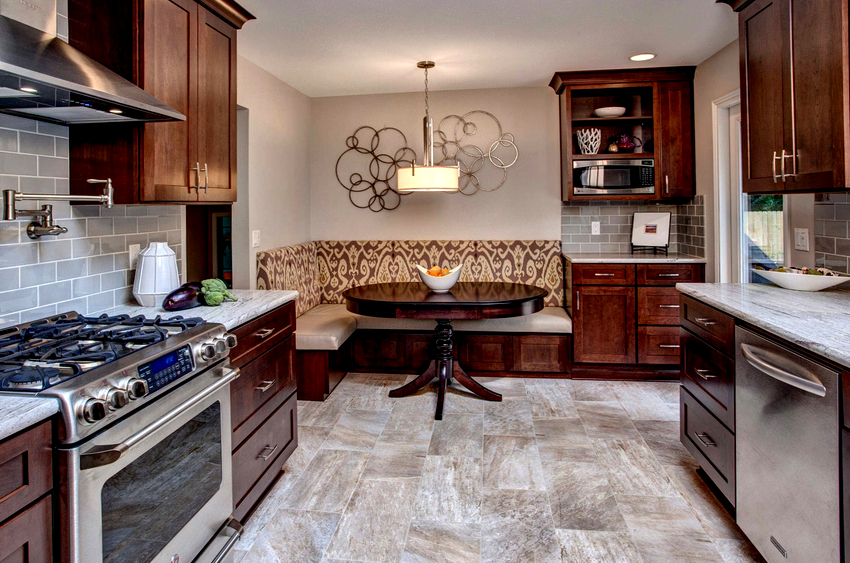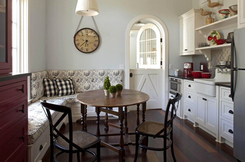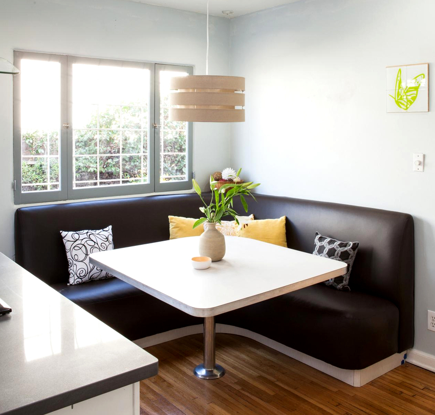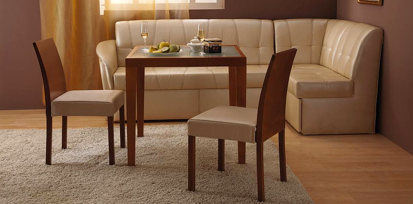 עצה שימושית! לרוב ספסלי הספה צורה מעוגלת. החלק הפינתי של מוצרים אלה נראה כמו מדף שטוח. כדי לספק מספיק מקומות ישיבה במטבח, מומלץ לרכוש שולחן אוכל עגול.