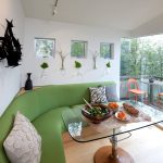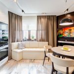 אין צורך שספה בצורת פודיום חצי עגולה תופסת את כל אורך חלון המפרץ. לידו, באזור החלון, תוכלו לארגן דלפק בר קטן.