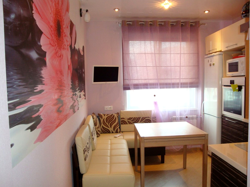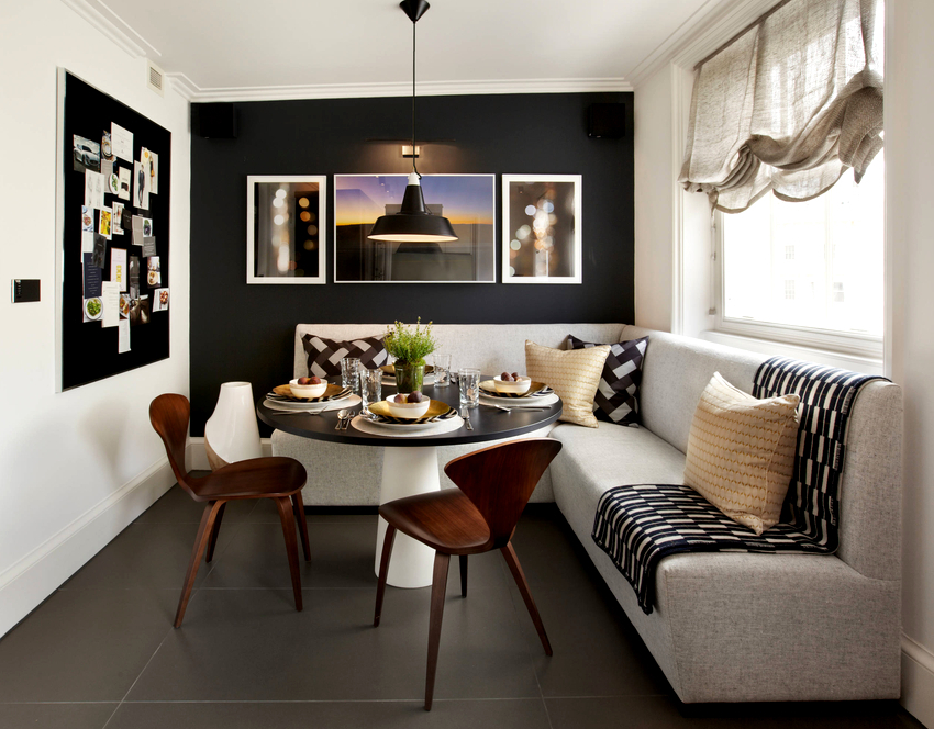 עצה מועילה! במטבחים, לעתים קרובות ניתן לראות אוזניות בצורת L, וריהוט כזה לא תמיד צמוד לקירות משני הצדדים. ניתן להשתמש ביעילות בעיצובים כאלה בכדי לחלק את החלל לפינת אוכל ולמקום בו מכינים אוכל. הספה הפינתית מותקנת בחדר האוכל.
