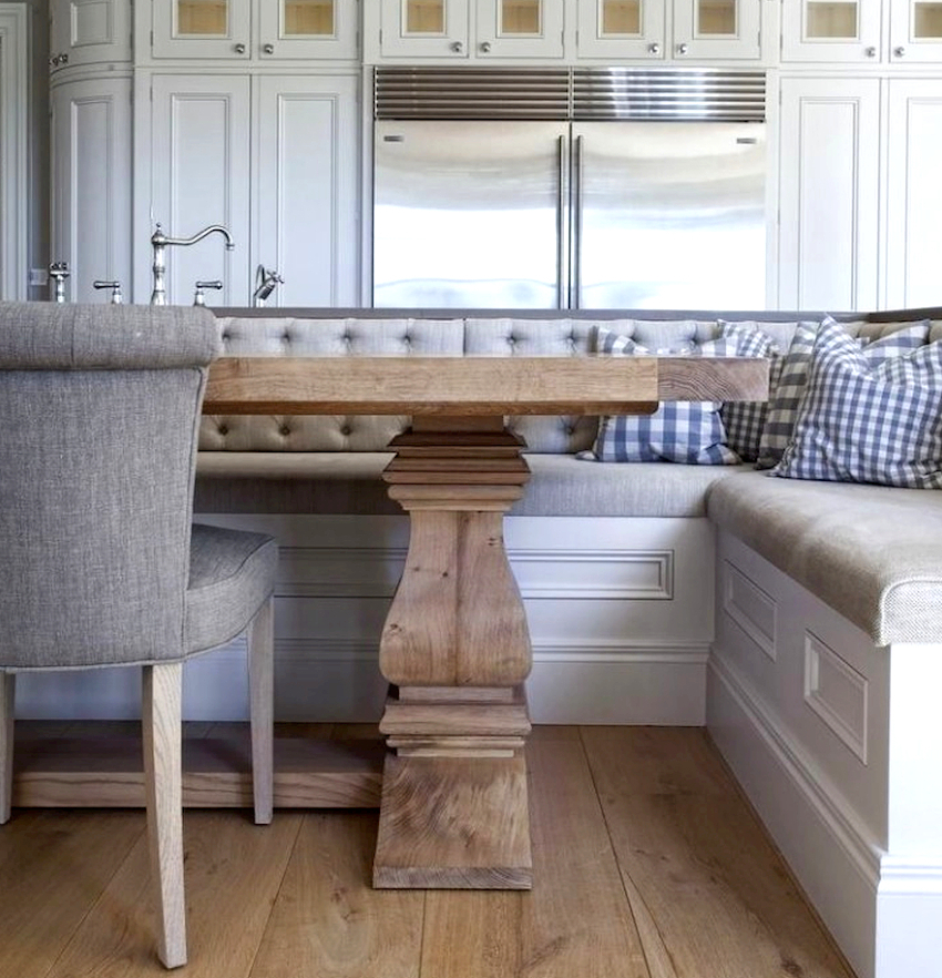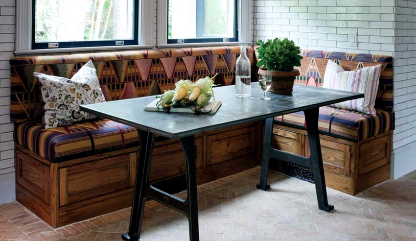 אם פנים החדר עשוי בסגנון וינטאג ', מומלץ להשתמש בספסל ספה כדי לארגן את פינת האוכל. בעיצובים כאלה, הגוף עשוי מעץ מלא והמושב נוצר מכריות רכות.