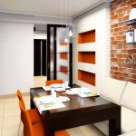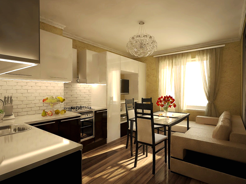 פינת האוכל יכולה להיות ממוקמת לא רק מול מקום העבודה, אלא גם בניצב אליו. יתרה מכך, אפשרות זו לסידור רהיטים מתאימה הן למטבחים מרווחים והן למטבחים קומפקטיים. במקרה האחרון, הספה הפינתית מונחת על קיר קצר.אם החדר גדול, תוכלו להשתמש בנישה מלאכותית שנוצרה מארונות לכלים למסגרת ריהוט אוכל וספה.