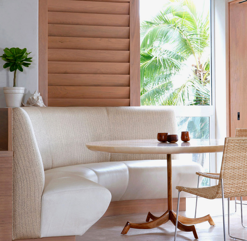 מטבח עם ספה פינתית קטנה מול אזור העבודה