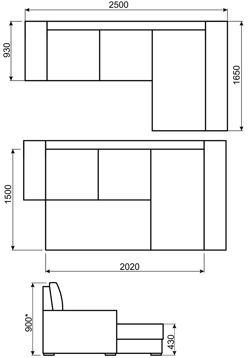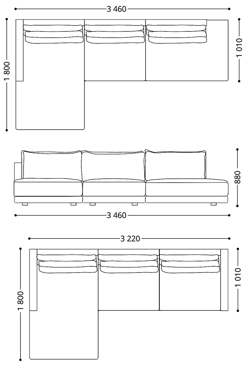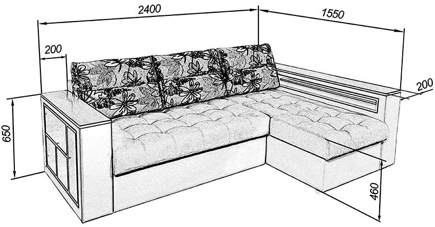 ציור של פינה לא סטנדרטית ספה עם מידות