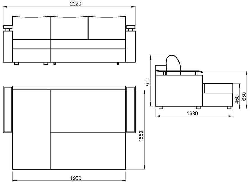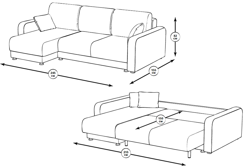 כאשר הם מורכבים, אורך הרהיטים יכול להיות בטווח שבין 2.45 ל -2.6 מ '. וריאציה זו בגדלים של ספות פינתיות קטנות נובעת מגיוון מבני שלהן. הממדים הכוללים תלויים בעיקר ברוחב משענות היד. בחלק מהדגמים העיצוב אינו מספק כלל נוכחות של אלמנטים אלה.