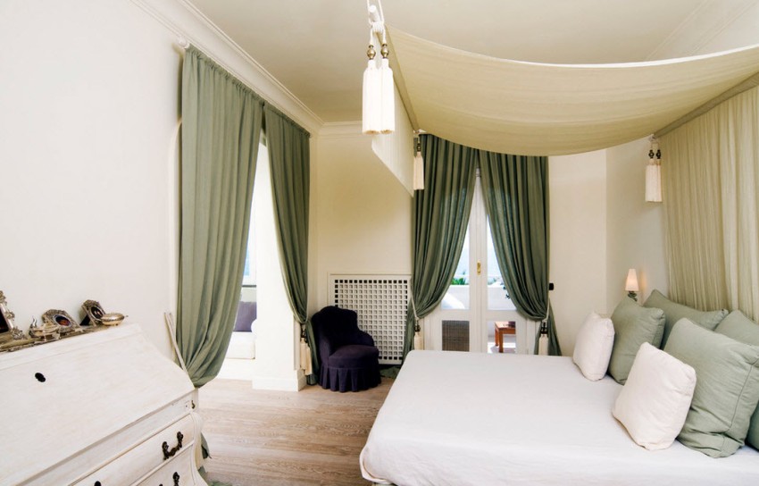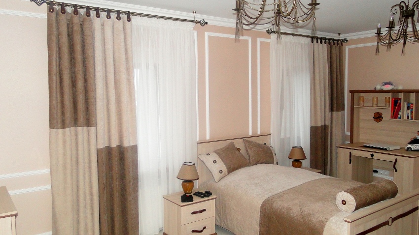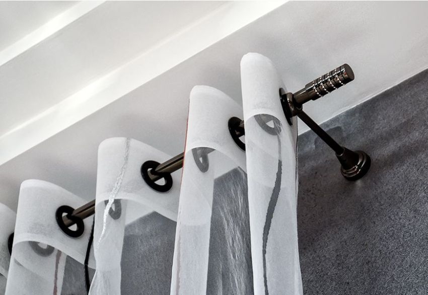 מוטות וילון תקרה מותקנים באמצעות אלמנטים דקורטיביים שונים כדי להסתיר את מנגנון ההידוק עצמו ולהפוך את החדר לאטרקטיבי עוד יותר