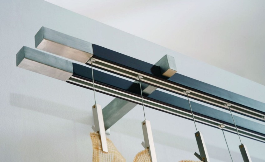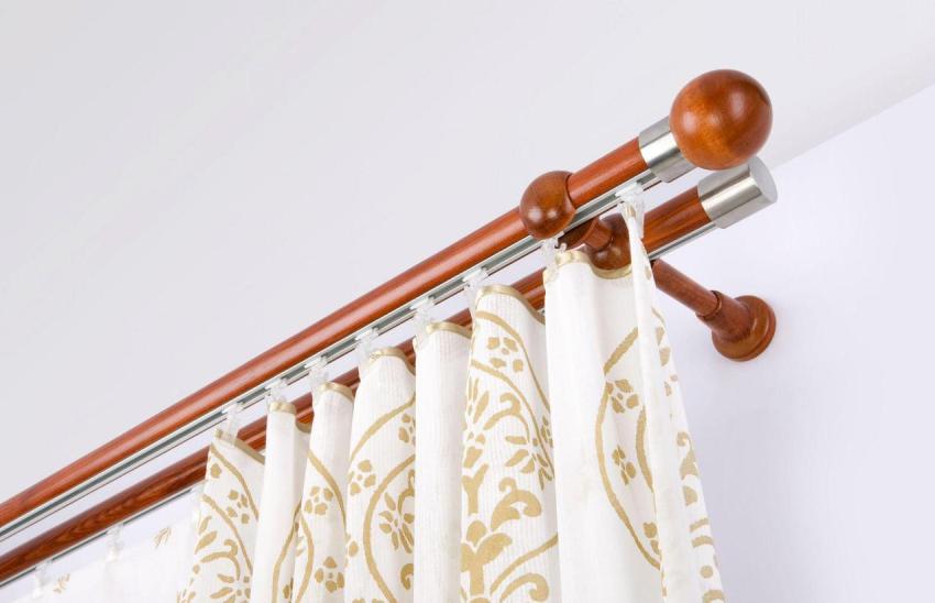 לאחר מכן, נשקול מהם וילונות למיקום הקיר, בהתאם לעיצוב. מוטות וילון עגולים או צינוריים הם מסורתיים ומקובלים. מודלים מודרניים מיוצגים על ידי מוצרים בשורה אחת ובשורה כפולה עם מוטות מקבילים בקטרים שונים.