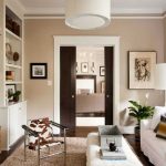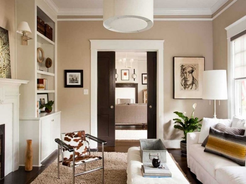 אם הקירות מרופדים בטפטים עם דוגמה או דוגמה גדולה, האפשרות הטובה ביותר היא דלת מונוכרום כהה, שהגוון שלה תואם את הצבע העיקרי של הגימור. בקומפוזיציות מונופוניות, דלתות אפורות ייראו מתאימות בפנים. עיצובי פנים של קפוצ'ינו או צבע חום ישתלבו בטווח הטונאלי החם של פנים החדר.