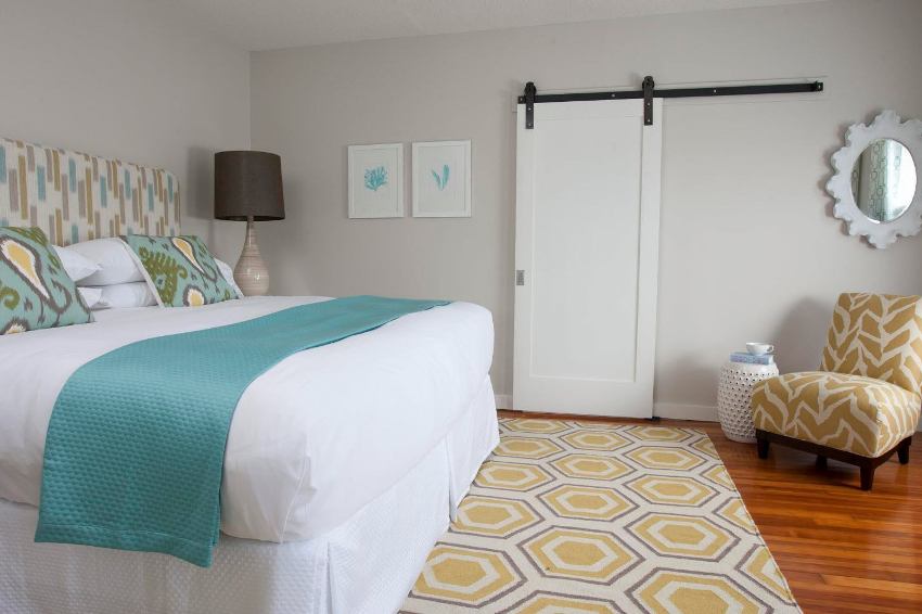 דלתות פנים קלות (התמונה מאשרת זאת בבירור) מסוגלות להגדיל את החלל באופן חזותי, ולהעניק לחדר קלילות מיוחדת. עיצובים כאלה נראים טוב בחדרים עם תקרות נמוכות. זהו גם הפיתרון הנכון היחיד במקרה של תקרות גבוהות, שכן גוונים כהים או בהירים של הדלת יוצרים רושם מדכא.