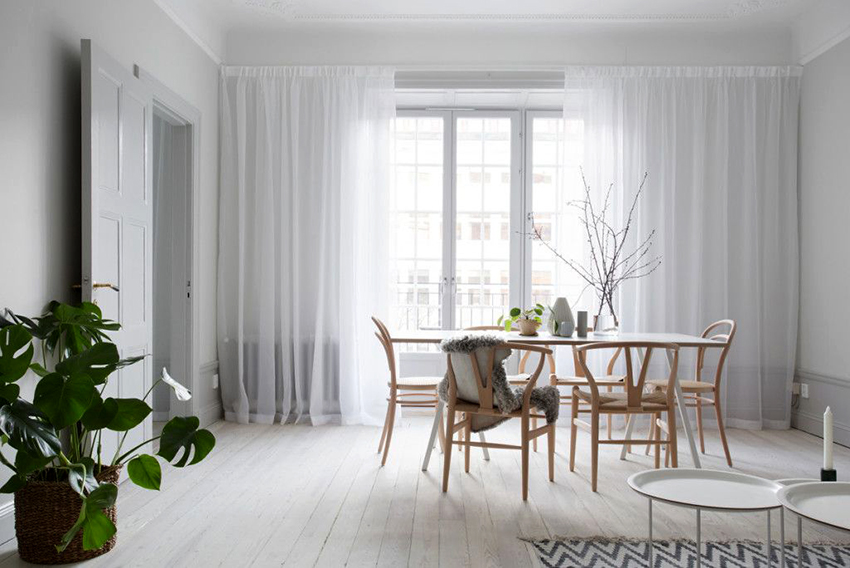 אפשרות עיצוב שכיחה למדי בסגנון סקנדינבי היא וילונות בהירים לאולם. בדרך כלל מדובר בשני בדים קצרים (לאורך גובה פתח החלון), המשדרים חלקית אור שמש. אפשרות זו משמשת לעיצוב חלונות נמוכים, אך רחבים ונמוכים יחסית.