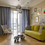 חוסר הסימטריה של מפלסי החלון והדלת מאפשר לך להשתמש בעקרון זה בעיצוב. הווילונות לאולם עם גוש דלת יכולים להיות ברוחבים שונים.