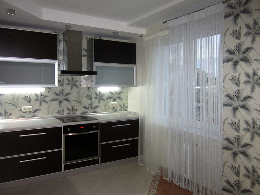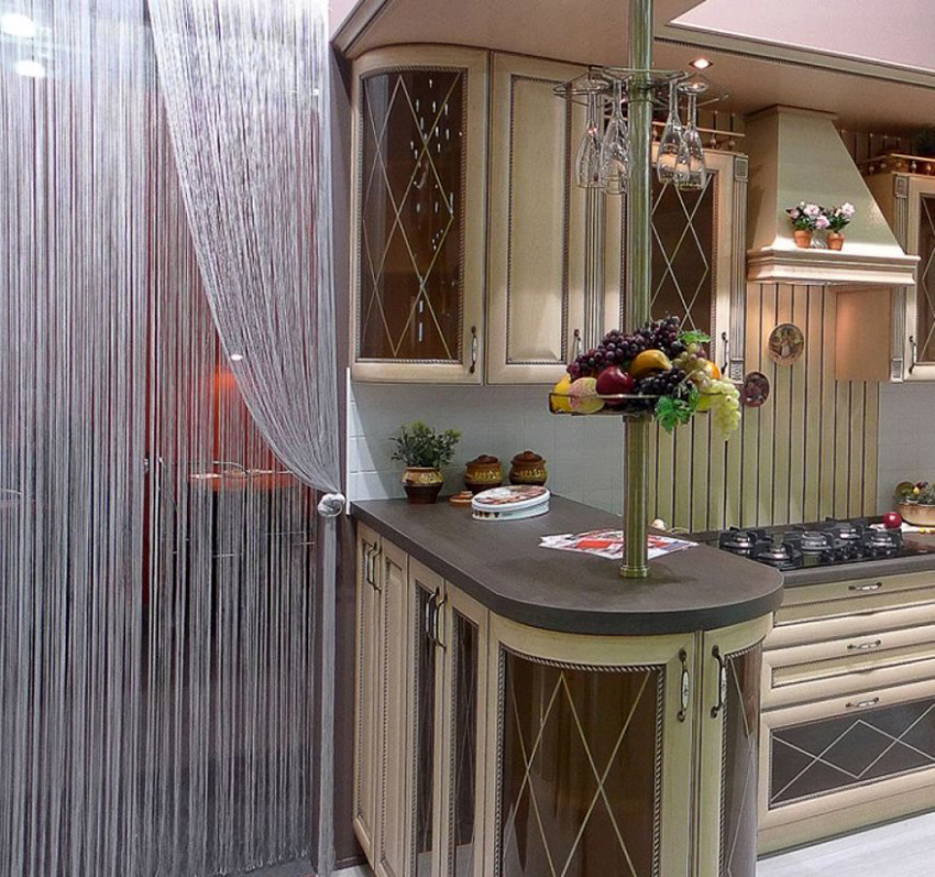 היתרונות העיקריים של שימוש בחוטי וילונות כוללים את קלילותם, את היכולת לא להעמיס את הפנים ולהעביר היטב אור וגם אוויר. בשל השקיפות שלהם, מוצרים כאלה מתאימים ליצירת פנים לא רק למטבח קטן, אלא גם למטבח גדול. בתצלום של טול וילונות, ניתן לראות כי החוטים משולבים לרוב עם מוצרי אורגנזה או בתוספת למרקין רך או קשה, אשר לקישוטם משתמשים בקפלים רכים, מונמכים בצידי פתח החלון.