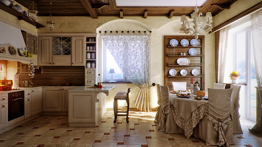 בסגנון כפרי או בסגנון כפרי בפנים, לעתים קרובות תוכלו למצוא טול קשת במטבח, כאשר באמצעותו אזור אדן החלון נשאר פתוח. אפשרות זו רלוונטית במיוחד כאשר משטח עבודה מאורגן מתחת לחלון ומותקן קטע שולחן נוסף. קשתות אורגנזה או רעלה מבוצעות בקפל דקורטיבי, או בשזירת שני בדים בצורת משולש. ליצירת עיצוב פרטני מומלץ להשתמש בסוגי בדים שונים הדומים בצבע, במרקם ובמרקם.