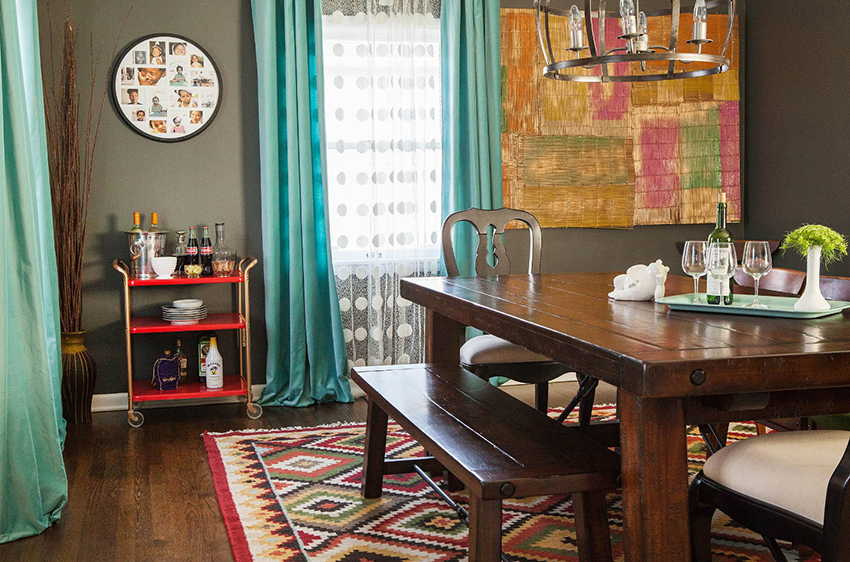 עצה שימושית! אם לטול יש עיצוב רב צבעוני ומורכב, אז חשוב שכל הגוונים שיש על המוצר יהיו נוכחים בצורה כזו או אחרת על חזיתות רהיטים, קירות, טקסטיל או אלמנטים דקורטיביים אחרים.