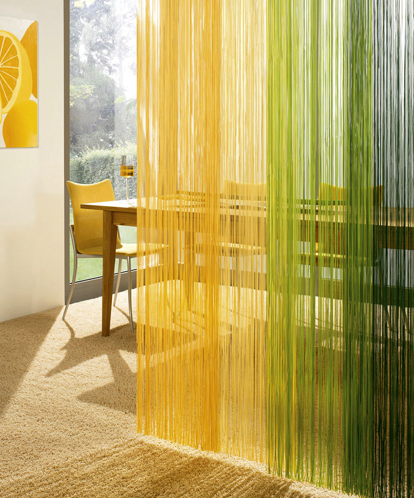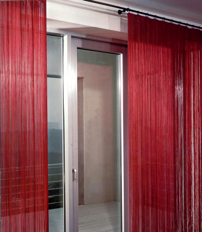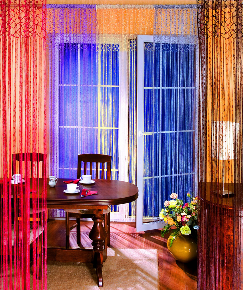 בייצור וילון מסוג זה משתמשים בחוטים ארוכים או קצרים שרוחבם יכול להגיע ל -5 מ"מ. כדי לגרום למוצרים להראות יפים ולזרוח בצורה מיוחדת, חרוזי אם הפנינה משמשים כפרטים קטנים. אם תבחר במוצרים באיכות גבוהה, אז הווילונות לא ידהו בשמש ויעממו. במקרה שהווילון נחשף כל הזמן לדראפט ולרוח, חוטים בודדים עשויים להיות קשורים זה בזה. בעת הכביסה, כדי למנוע סבך של טול המוסלין, יש לקשור אותו מראש.