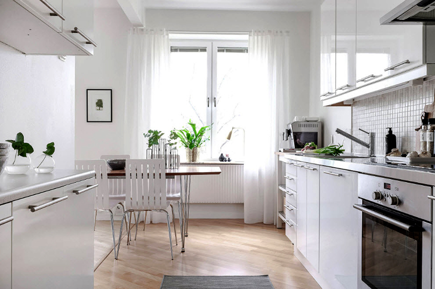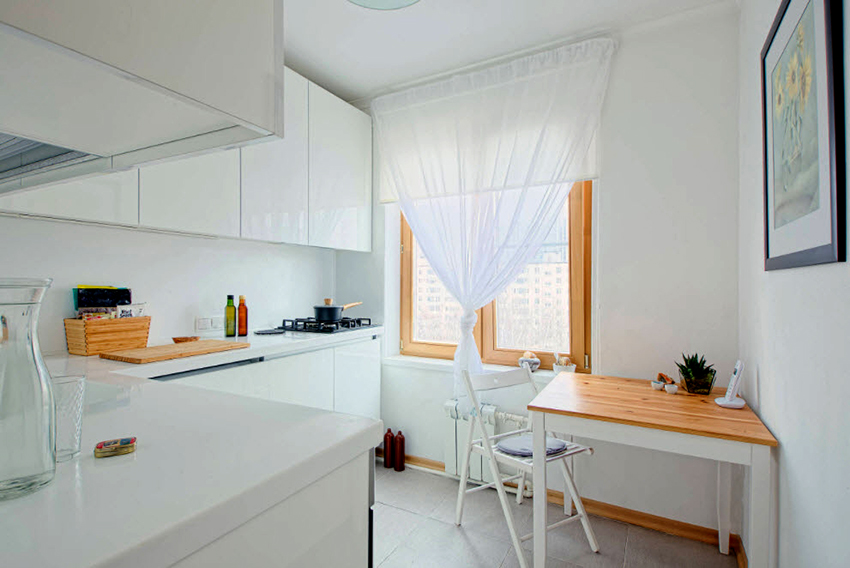 האופציה המסורתית ביותר היא טול לבן שקוף למטבח, המסייע בהגדלה חזותית של חדר קטן. וגם מוצרים לבנים שייכים לאפשרויות האוניברסליות עבור וילונות המתאימים להשלמת כל פנים חלל המטבח.