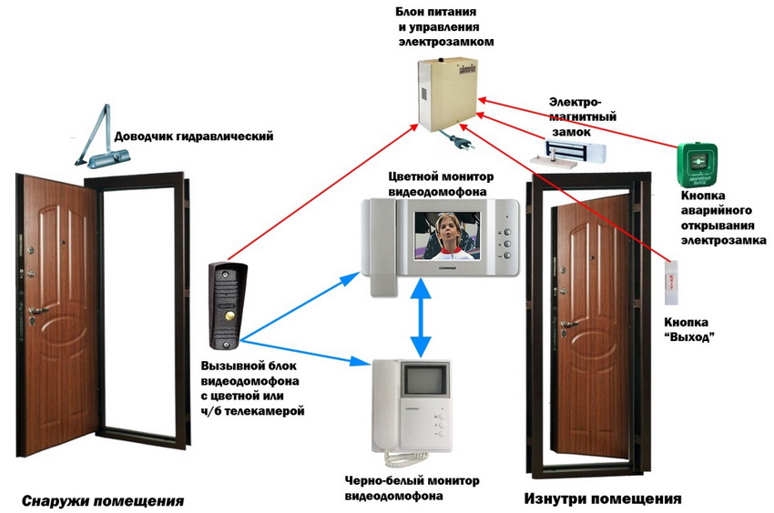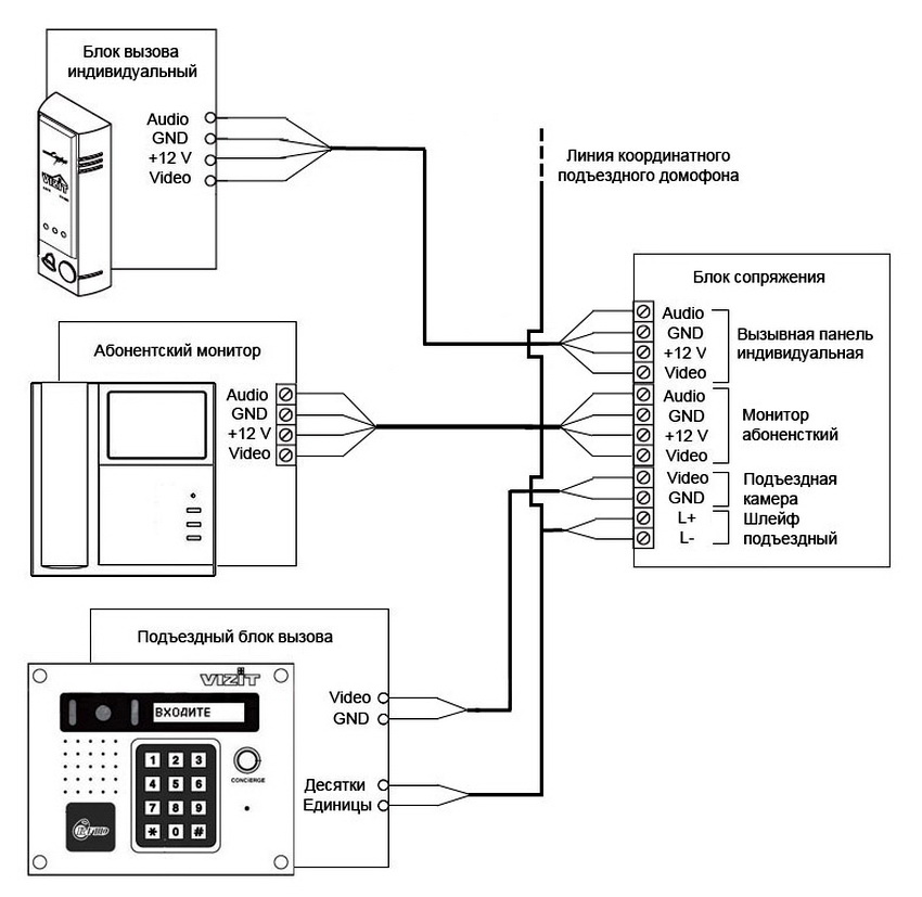 עקרון החיבור פשוט. המצלמה ולוח השיחות מחוברים לבקר עם ארבעה חוטים. הם בצבעים שונים, מה שמפשט מאוד את תהליך ההתקנה. לרוב, החוט הכחול נפוץ, החוט האדום הוא אות השמע, החוט הלבן הוא הווידיאו, והחוט הצהוב הוא הכוח העיקרי.
