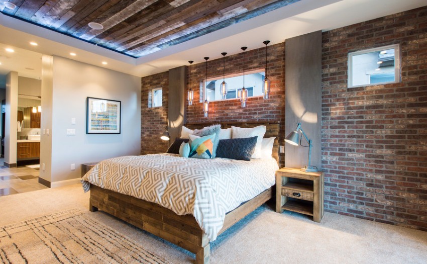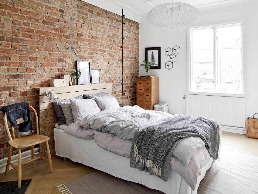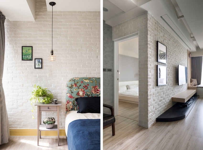 ניתן להשתמש בשיטה להדגשת קיר אחד בקיר לבנים לבן גם בחדר השינה. טפטים אלה מודבקים למשטח שמאחורי ראש המיטה. מותר לסיים בצורה של חיקוי של לבנים מהצד שממול למקום השינה או ליד החלון. וילונות שקופים, עור על הרצפה או שטיח חם, כריות בהירות על המיטה מתאימים כתוספת דקורטיבית.
