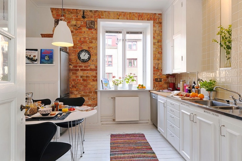 במטבח חיקוי של לבנים דקורטיביות לבנות על הטפט ייראה נהדר בשילוב עם החומרים הבאים: