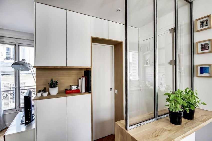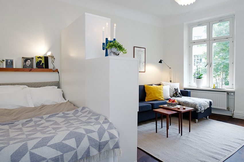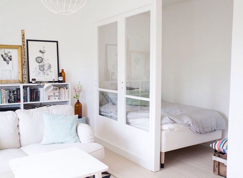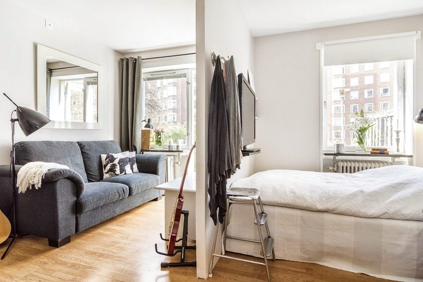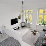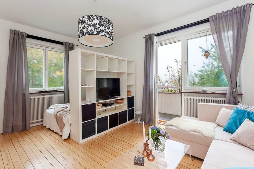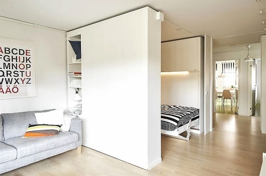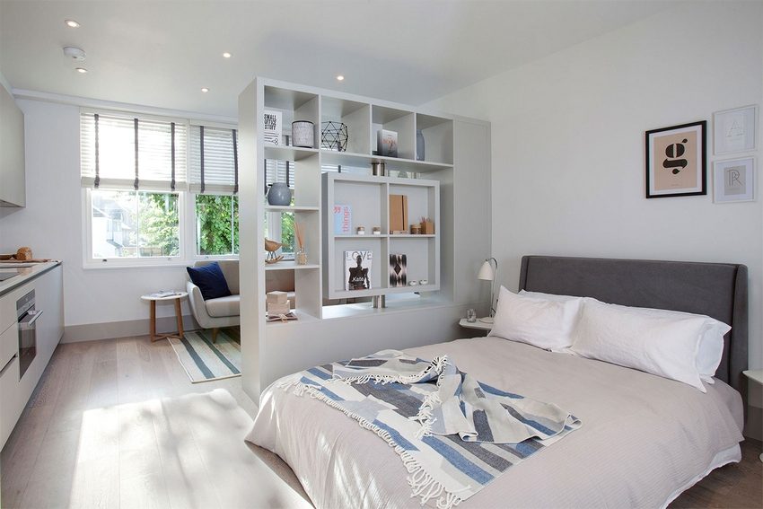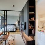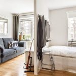 לא נדרש מקום רב לפתיחת דלת נדנדה, אך ארון מעבר או שלם עם דלת הזזה יספק חיסכון מרבי במקום שמיש. באזור ליד החלון תוכלו להצטייד בסלון ובחצי השני לצייד חדר שינה. כדי לספק לחדר השינה תאורה מספקת, תוכלו לצייד את המחיצה במנורות LED.