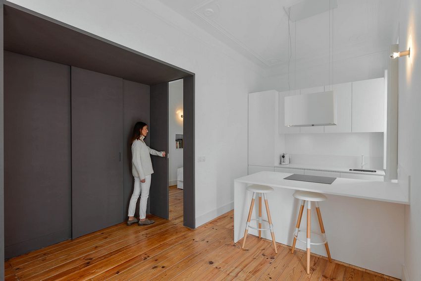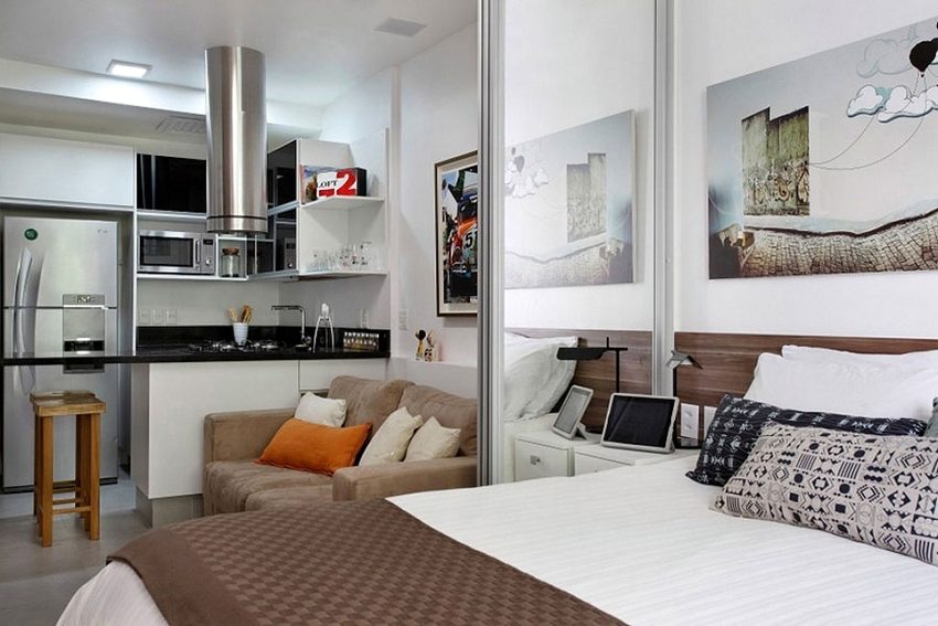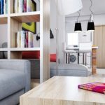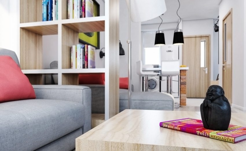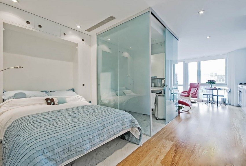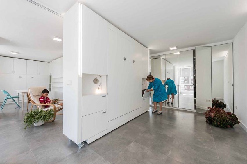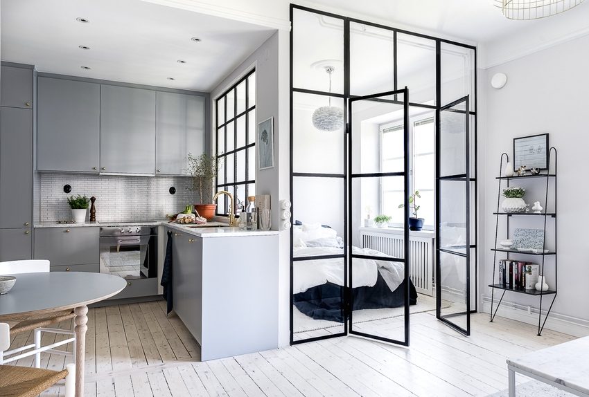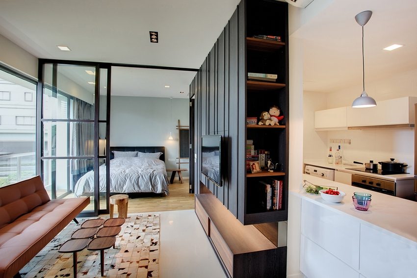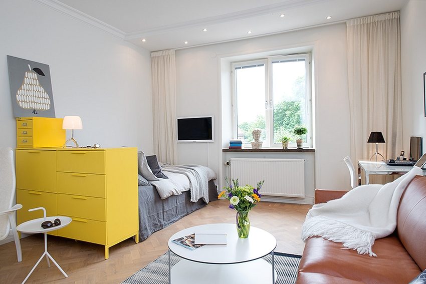לא נדרש מקום רב לפתיחת דלת נדנדה, אך ארון מעבר או שלם עם דלת הזזה יספק חיסכון מרבי במקום שמיש. באזור ליד החלון תוכלו להצטייד בסלון ובחצי השני לצייד חדר שינה. כדי לספק לחדר השינה תאורה מספקת, תוכלו לצייד את המחיצה במנורות LED.