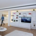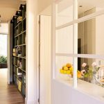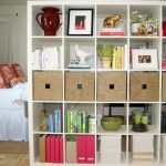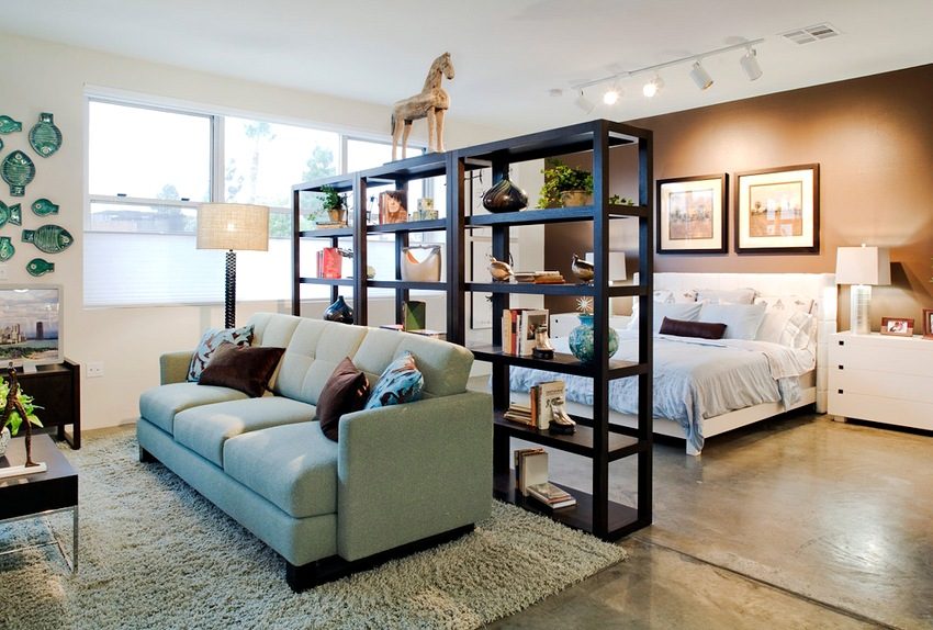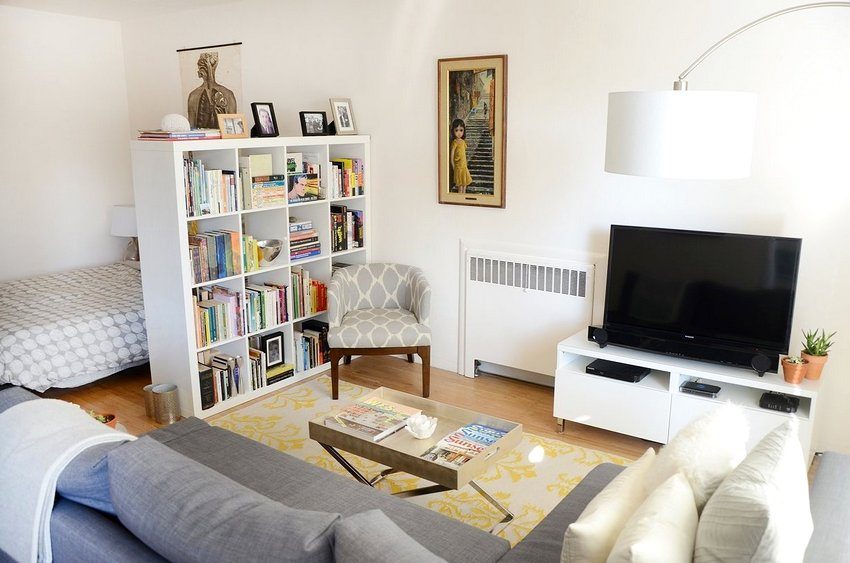 המדפים מפרידים בין המסדרון לסלון. במקרה זה, הקיר הראשי מוסר, כמובן, אם הוא אינו נושא עומס. קופסאות אחסון מונחות בחלק התחתון, ועדיף להשאיר את האזור העליון ריק או עם נוכחות מינימלית של חפצים.