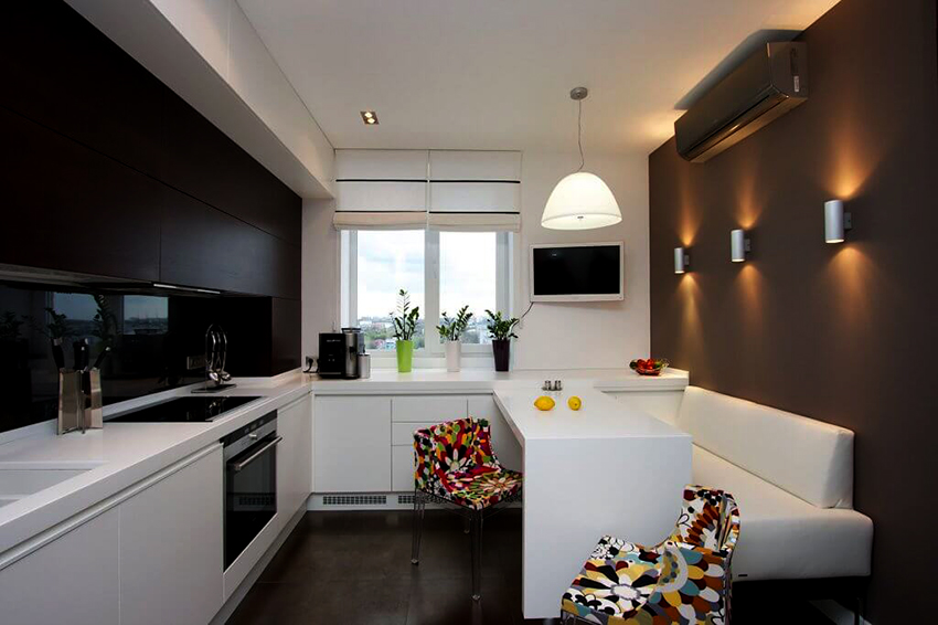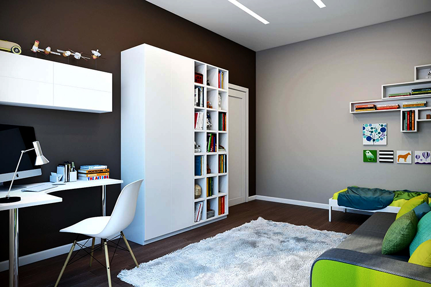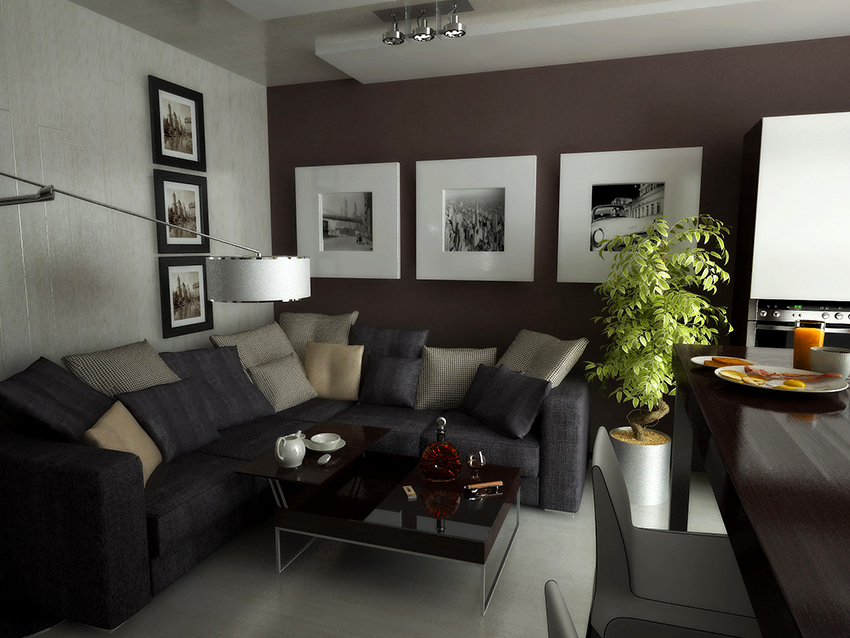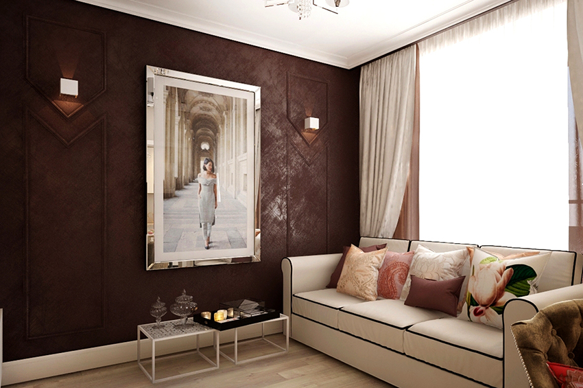 למרות העובדה שגוונים כהים מצמצמים את החלל באופן חזותי, עם השילוב המיומן שלהם עם צבעים אחרים, אתה יכול להרחיב חזותית את חלל החדר. טכניקה זו משמשת לעיתים קרובות בחדרים צרים, שבהם הקיר הקצר הרחוק או שני המשטחים ההפוכים נוצרים בעיצוב כהה.