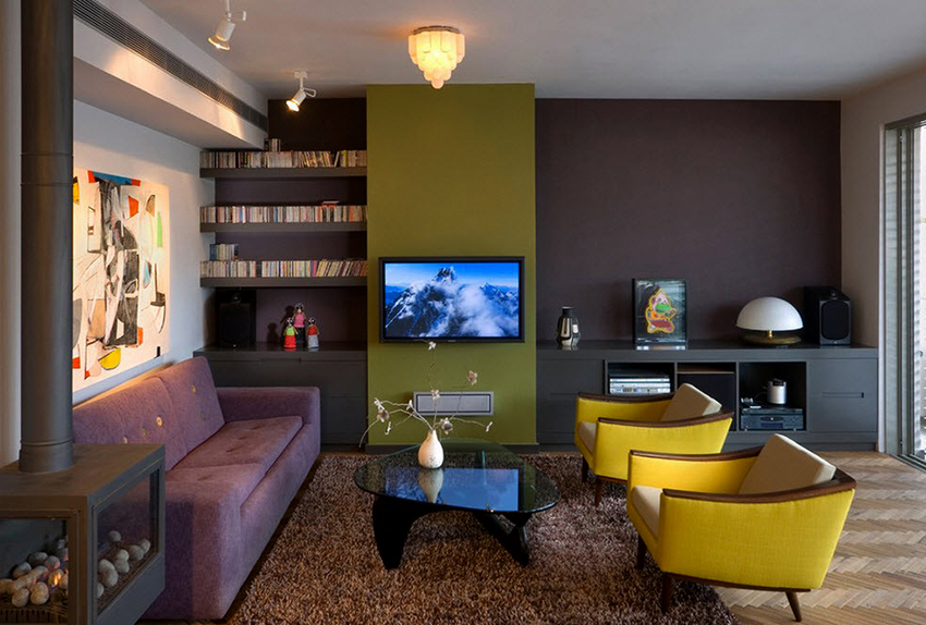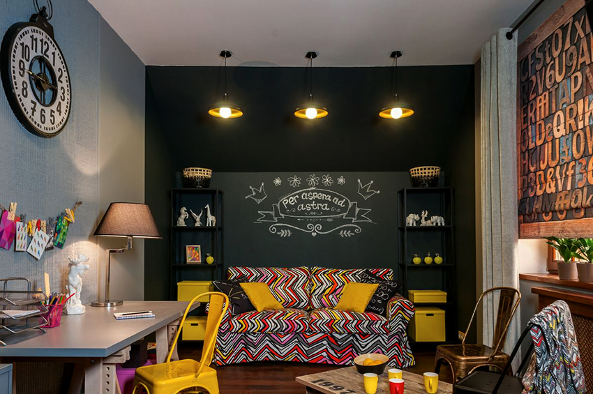 גוונים בהירים כמו ירוק, ורוד, כתום וסגול נראים מנוגדים וצבעוניים על רקע שחור. שילובים אלה מתאימים בחדרי מגורים כאזורי מבטא המושכים תשומת לב כללית.