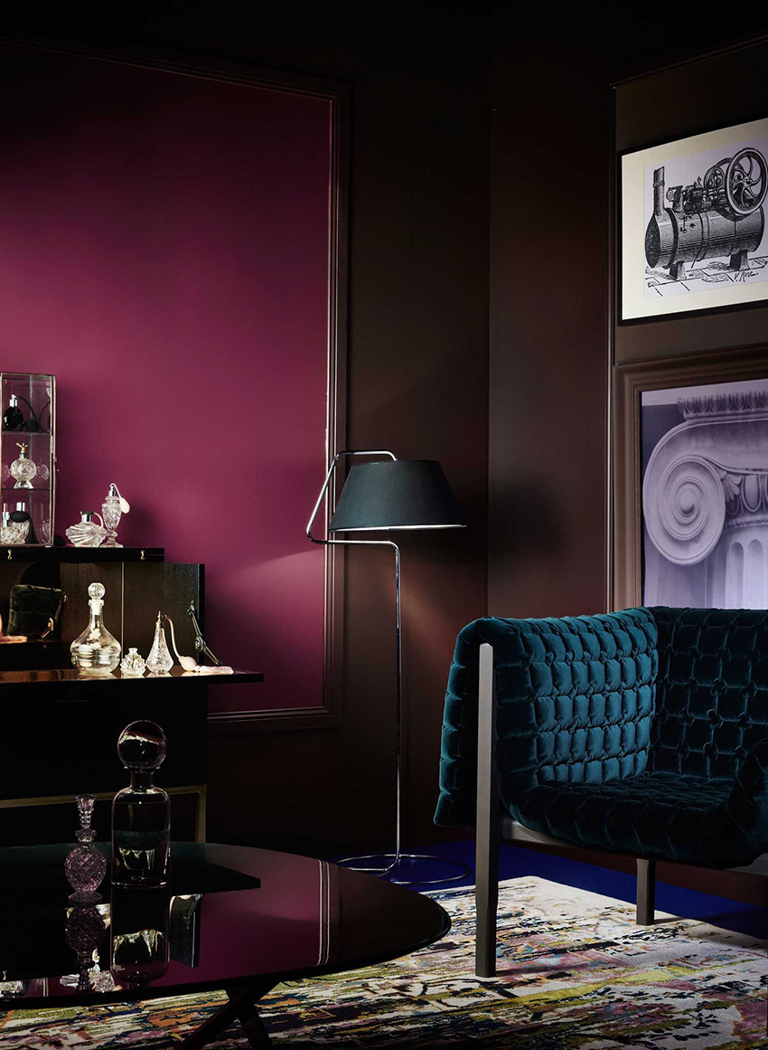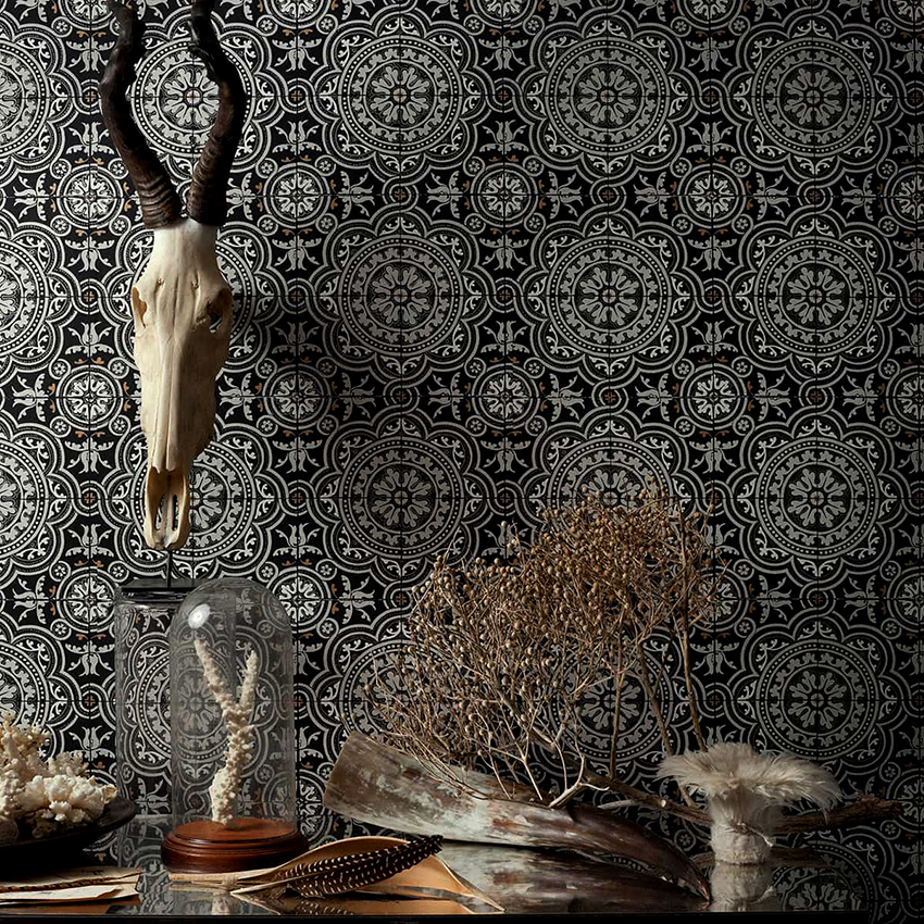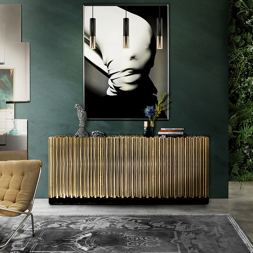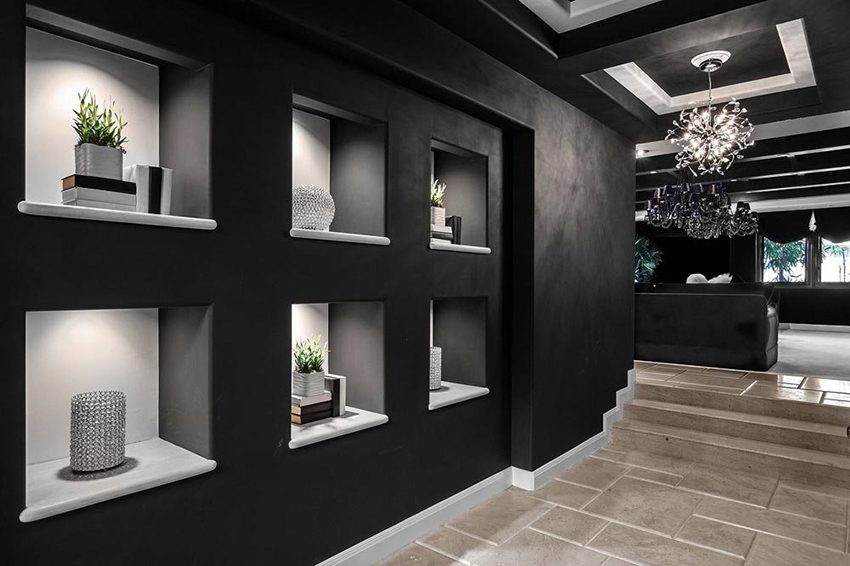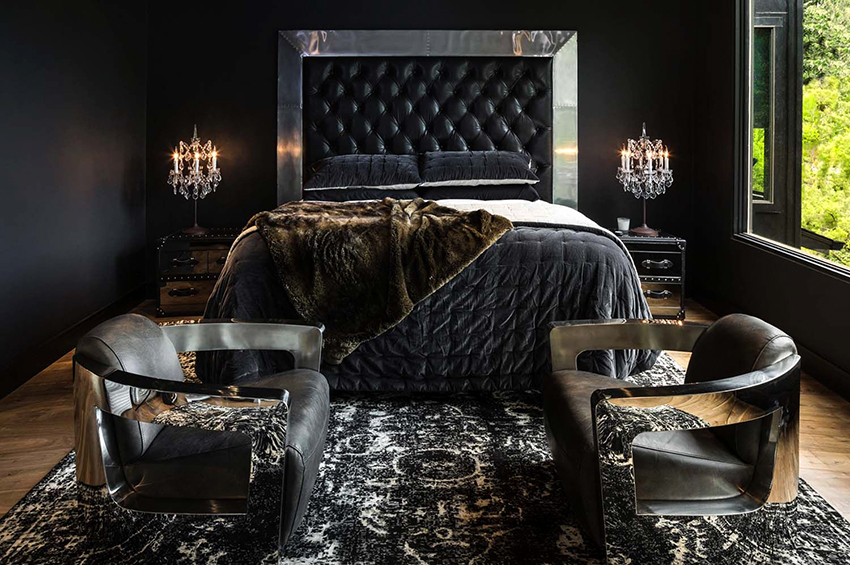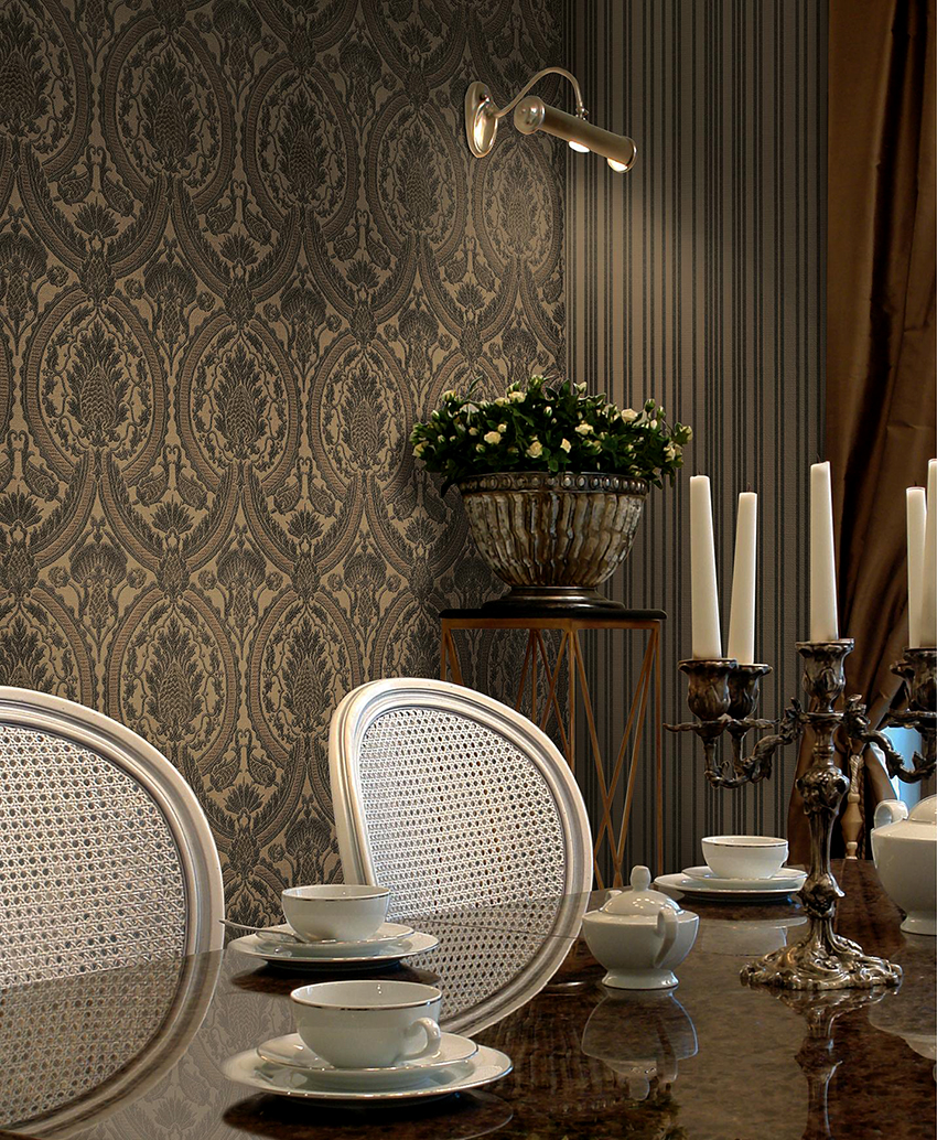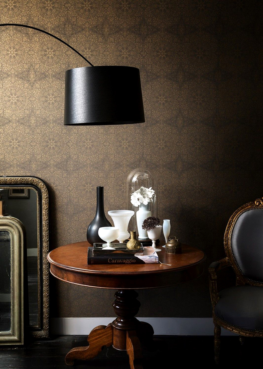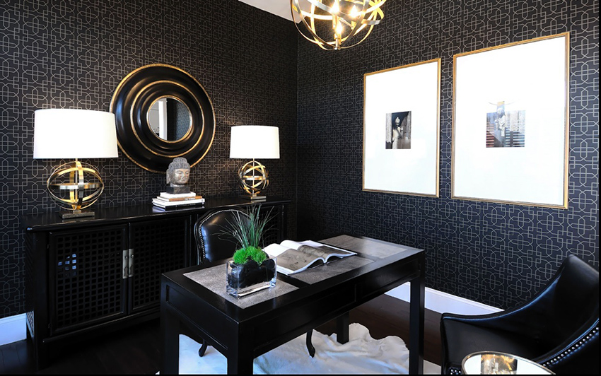 הוד מלכותו של האווירה מודגש על ידי טפט שחור בשילוב גוון זהוב, שיכול לחפוף אביזרים או הוספות על רהיטים.