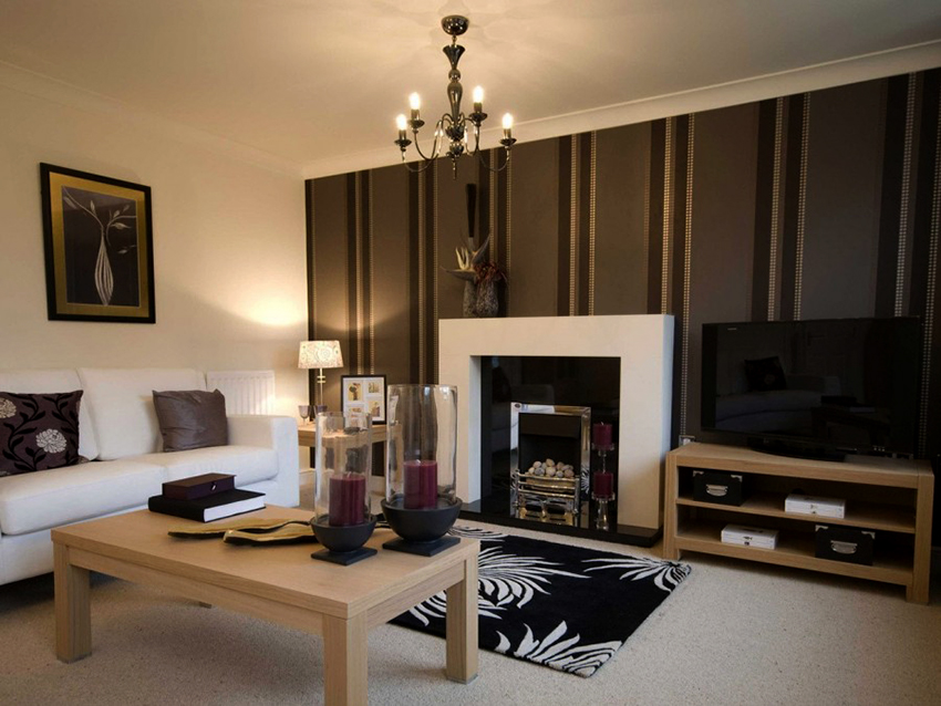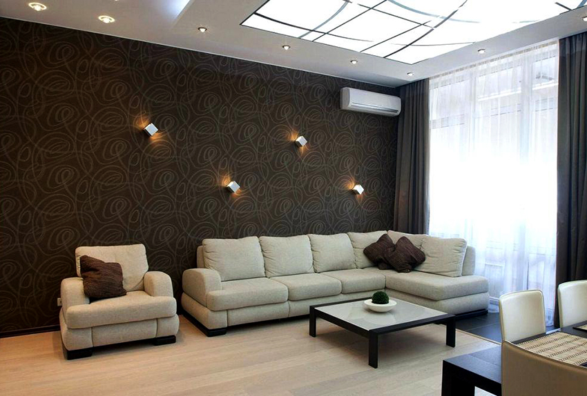 ניתן להצביע על הקיר שמאחורי הספה או האח, וכל שאר המשטחים מעוטרים בפלטת צבעים בהירה. טפטים כהים נראים מקוריים ומהפנטים באולם עם דוגמה צבעונית המהדהדת את העיצוב של טקסטיל או ריפוד רהיטים. טכניקה אופטימלית נוספת תהיה שילוב אופקי של גוונים, כאשר החלק התחתון של הקיר מבוצע בגוון כהה, והחלק העליון בגוון בהיר. ניתן יהיה להדגיש את המוזרות של הפריסה בעת שימוש בטפטים כהים לקישוט נישות ונדפים.