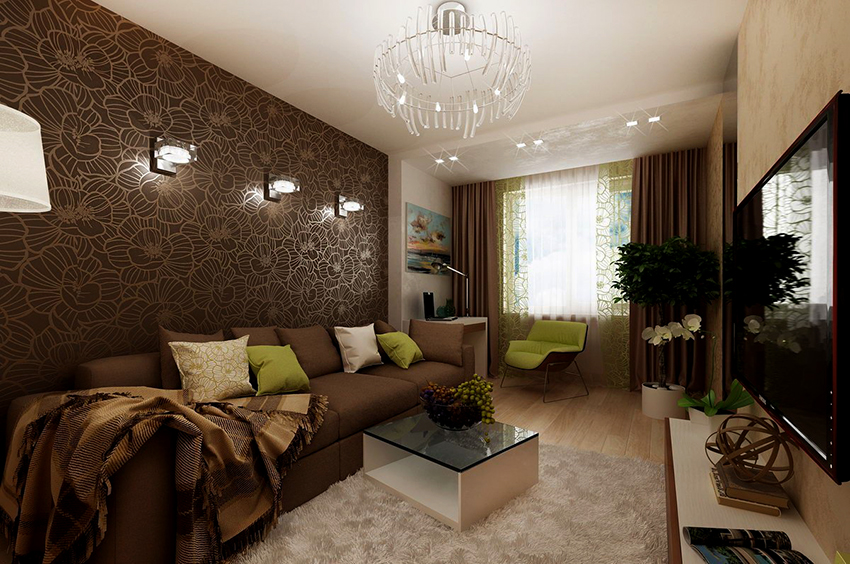 הקיר הכהה ביותר צריך להיות מול החלון. במקרה זה, הוא יודלק במהלך היום, מה שיהפוך את האווירה לחופשית ונינוחה יותר. יש צורך לטפל במקורות של אור מלאכותי בצורת פמוטי קיר, מנורות רצפה ומנורות תקרה, אשר אמורים להיות ממוקמים בכל החדר, על מנת להבטיח את התאורה האחידה שלו.