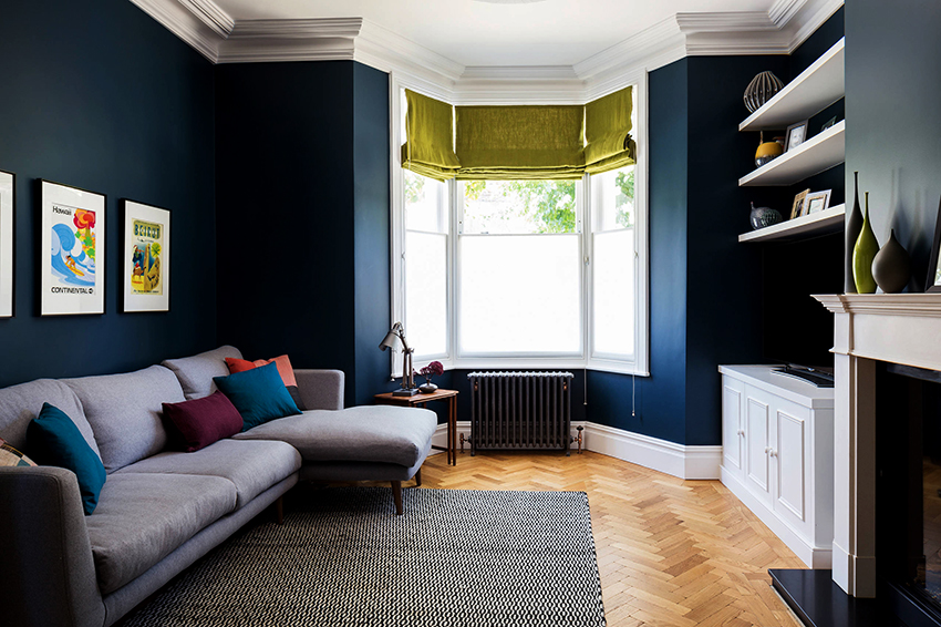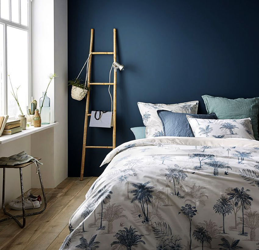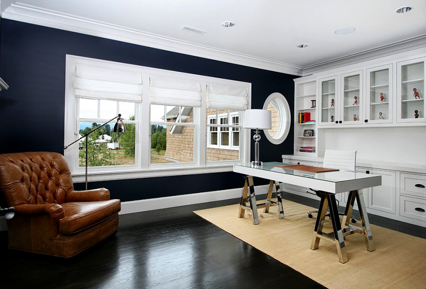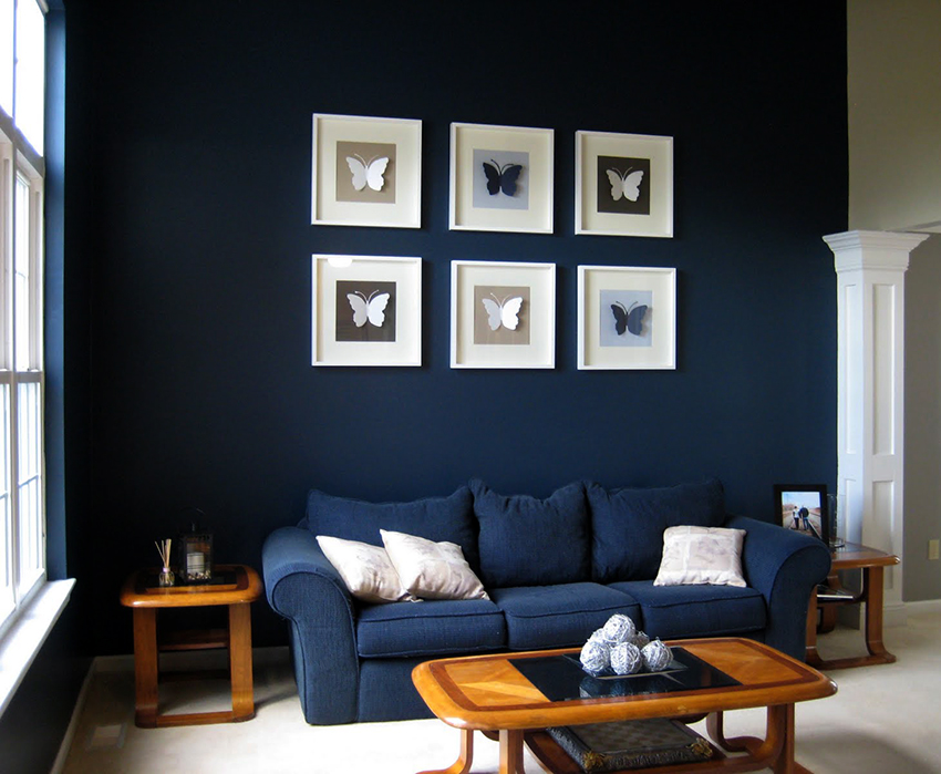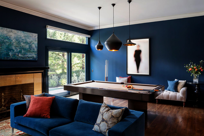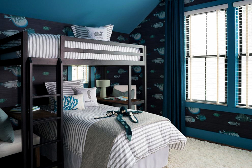הגדרה רגועה אך אקספרסיבית תושג על ידי שימוש בכחול כהה על אחד הקירות, בעוד משטחים אחרים יסיימו בפלטה כחולה, אפורה או כחולה-ירוקה. גוונים כתומים, פטל, ורודים או אדומים שמושכים תשומת לב לעצמם נראים לא הולמים. שילובים שונים מוצגים בתצלום של טפטים לחדר.