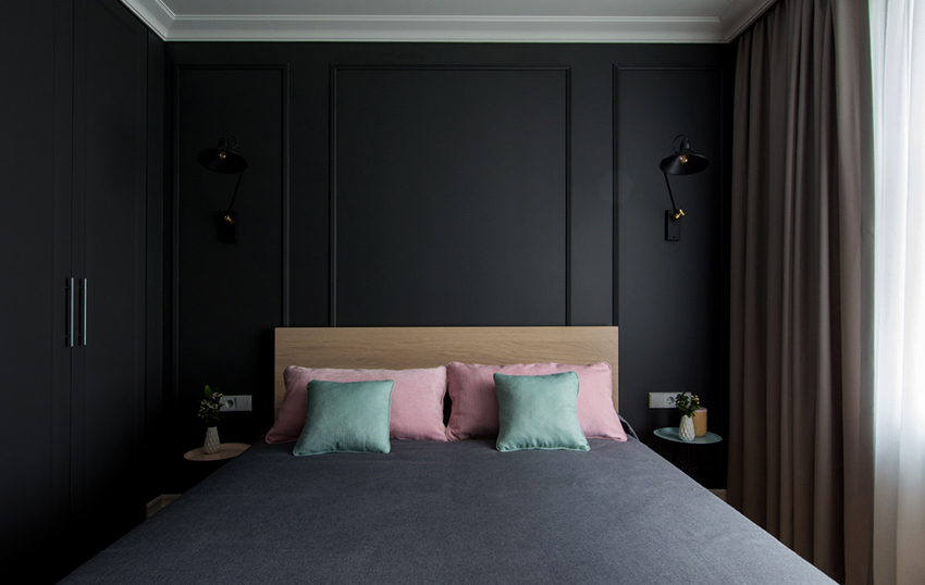 עצה מועילה! הגימור הכהה של חדר השינה נמצא בהרמוניה מושלמת עם שקעי אור ומתגים שאינם מתמזגים עם הקירות, מה שמקל עליהם למצוא בחושך.
