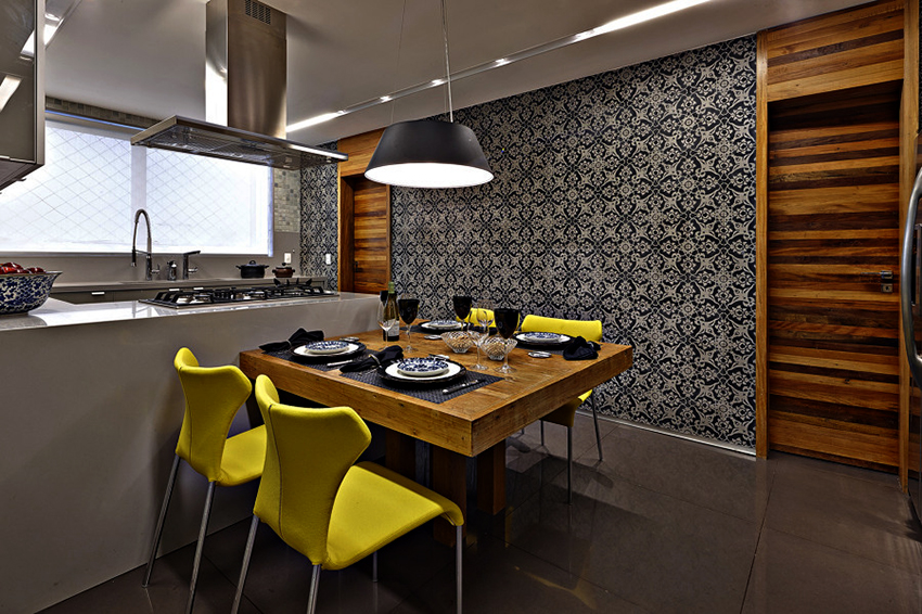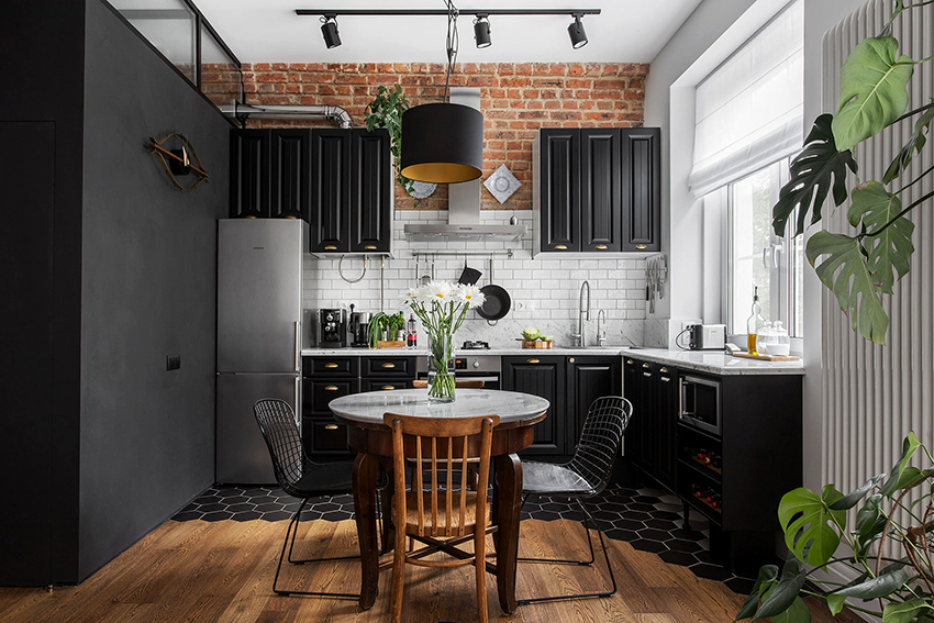 עיצוב פנים מטבח עם טפט כהה על הקיר