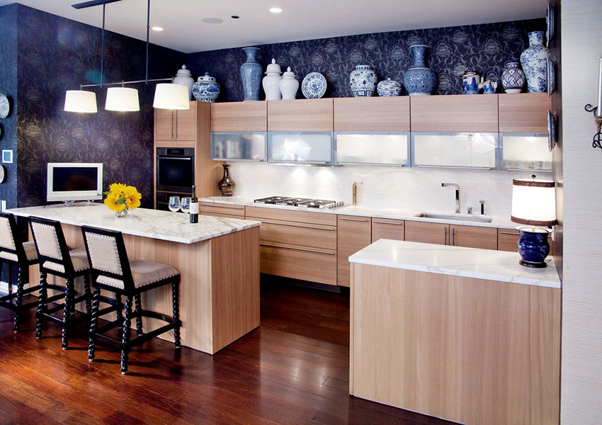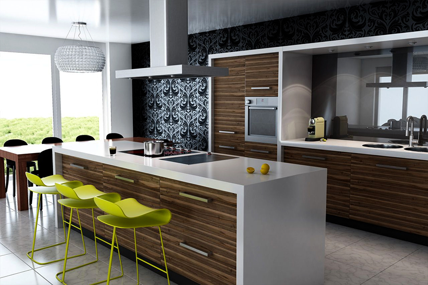 - 6 עיצוב פנים מטבח עם טפט כהה על הקיר