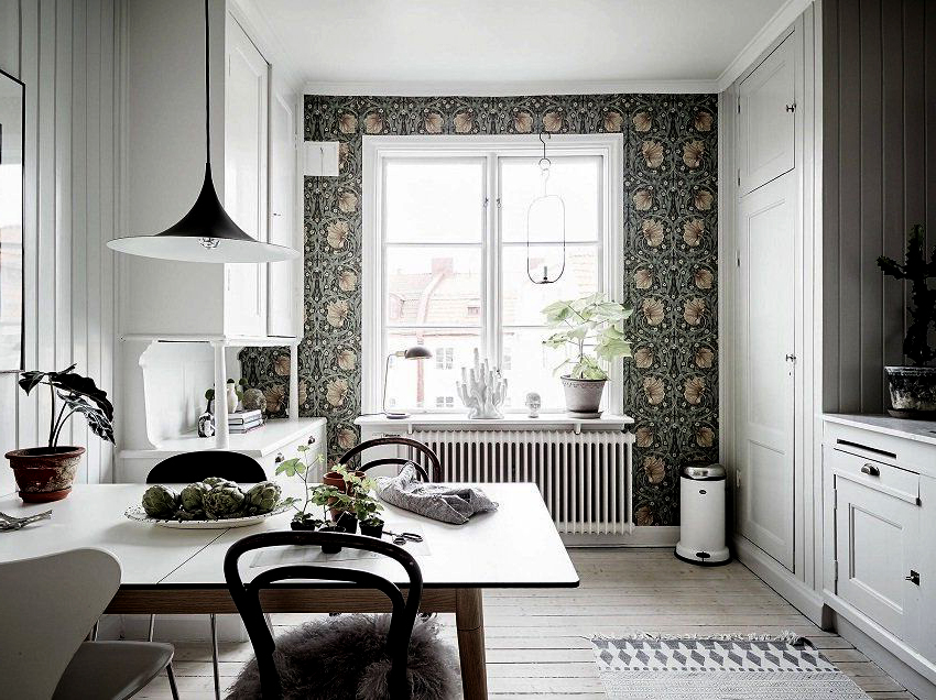 מומלץ לקשט את המטבח בסגנון סקנדינבי עם טפט כהה. משטחים כאלה משתלבים היטב עם ריהוט מעץ בהיר ויוצרים תחושה של נוחות ביתית וחמימות. במקרה זה, יש להתאים את צבע המכשירים הביתיים לגוון הקירות. בפנים כזה עם קירות כהים, הדגש הוא על אלמנטים הפמליה בצורת רהיטים, כלים ועיצוב, העשויים בעיצוב כפרי כפרי לקוני.