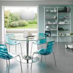 Apvalumas suteikia malonės interjerui. Pietų stalas su stikliniu viršumi