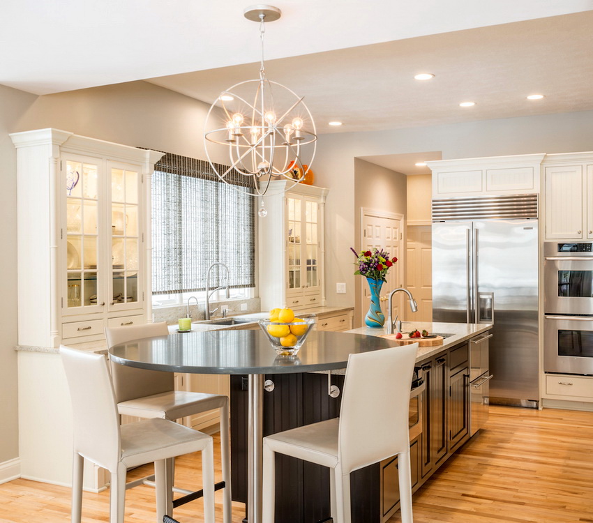 Naudingi patarimai! Pirkdami apvalų stalą virtuvei, turite atsižvelgti į apšvietimo būdą. Jei jis užima kampinę erdvę arba yra gerokai nutolęs nuo centro, kur yra pagrindinis lubų šviestuvas, geriau pasirūpinti papildomu apšvietimu. Tai papildys dizainą, atitrauks valgomojo zoną nuo darbo zonos ir sukurs papildomą komfortą.