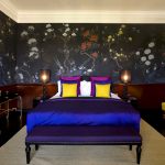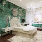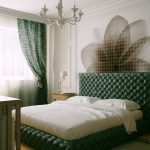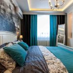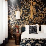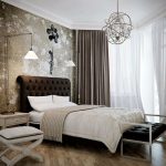 - Naudodami raštus, įvairias monogramas, garbanas ir audinius ant tapetų, miegamąjį galite paversti tikra teatro sale. Jei tapetai bus papildyti bordo, mėlynos spalvos, pridedami auksiniai dekoratyviniai elementai, tada miegamasis atrodys kaip rūmų.