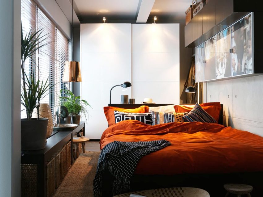 Dengan susunan yang rasional dan dimensi yang sesuai, anda boleh meletakkan semua perabot yang diperlukan di ruangan sedemikian. Foto reka bentuk bilik tidur kecil seluas 12 meter persegi atau kurang akan membantu menentukan penempatan tempat tidur yang rasional dan selesa: di bawah tingkap atau di sepanjangnya, tegak lurus ke dinding dan bahkan di tengah-tengah bilik.
