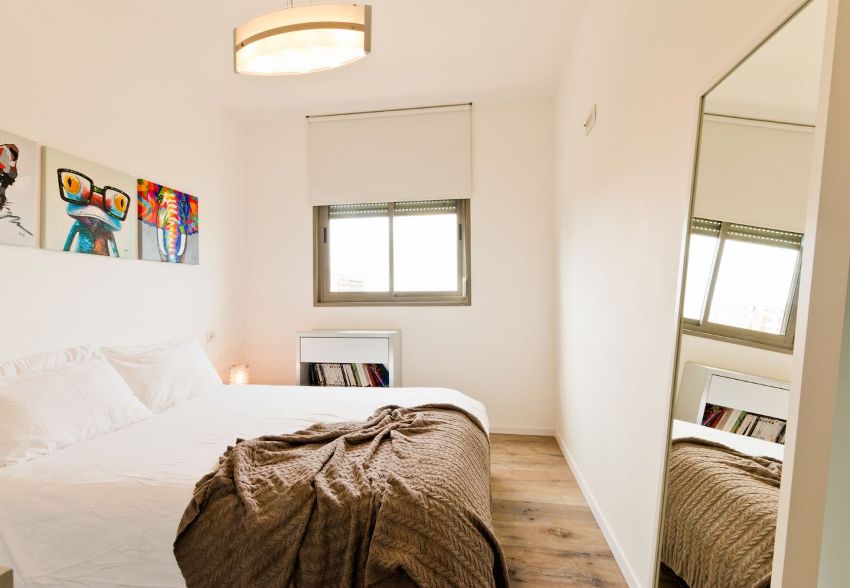 Sekiranya tidak ada pilihan, katil lebih baik memilih ketinggian rata-rata (50-60 cm) dan lebar (160-170 cm). Meja sisi katil boleh diganti dengan rak dinding. Lebih baik membetulkannya di kepala tempat tidur pada tingkat lengan yang terentang (dalam posisi rawan) agar dapat mengambil dan meletakkan benda dengan bebas. Untuk kerja, yang terbaik adalah menggunakan konsol kecil dengan lampu meja atau luminer mudah alih, dan melengkapkannya dengan kerusi yang boleh ditarik ringan. Ia tidak boleh menghalang laluan apabila tidak digunakan.