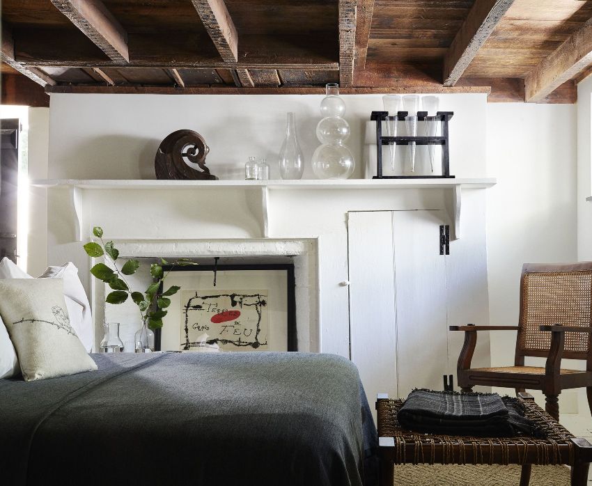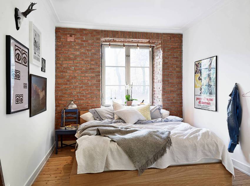 Contoh yang baik untuk menggunakan batu bata hiasan di bahagian dalam bilik tidur