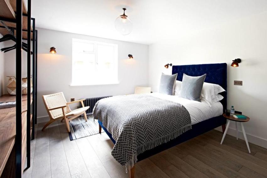 Dinding sconce dalam reka bentuk kreatif digunakan sebagai pencahayaan tambahan di bahagian dalam bilik tidur