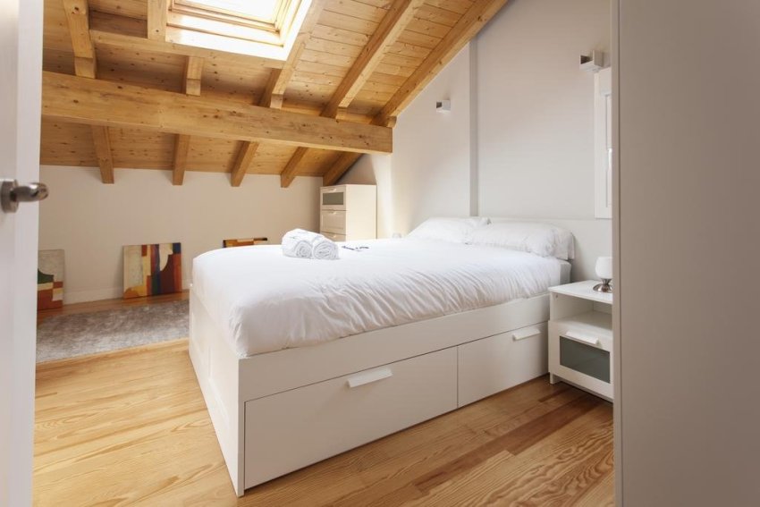 Kaki tinggi dan tilam tinggi akan menaikkan tempat tidur ke ketinggian yang diingini. Pilihan mungkin katil dengan laci... Lebih baik jika ada dua laci, dan tidak satu yang besar: lebih mudah untuk menariknya keluar dalam kes ini, dan isinya dapat dibahagikan mengikut tujuan. Sekiranya anda membeli tempat tidur selebar 200 cm, tetapi selebar 190 cm, anda tidak akan mengalami ketidakselesaan, tetapi secara visual bilik akan mendapat manfaatnya, 10 cm akan mengosongkan ruang dengan ketara.